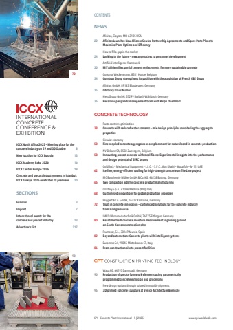 CPI %u2013 Concrete Plant International %u2013 5 | 2025 www.cpi-worldwide.comCONTENTSNEWSAfinitas, Clayton, MO 63105 USA22%u0009 AfinitasLaunches New Alliance Service Partnership Agreements and Spare Parts Plans toMaximize Plant Uptime and EfficiencyHow to fill a gap in the market24%u0009 Looking to the future %u2013 new approaches to personnel developmentArtificial intelligence framework30%u0009 MIT AI identifies partial cement replacements for more sustainable concreteConstrux Weckenmann, 8531 Hulste, Belgium34%u0009 Construx Group strengthens its position with the acquisition of French CBE GroupAfinitas GmbH, 89143 Blaubeuren, Germany35%u0009 Obituary Klaus M%u00fcller Hess Group GmbH, 57299 Burbach-Wahlbach, Germany 36%u0009 Hess Group expands management team with Ralph QuellmalzCONCRETE TECHNOLOGYPaste content optimization38%u0009 Concrete with reduced water contents %u2013 mix design principles considering the aggregatepropertiesCircular economy 50%u0009 Fine recycled concrete aggregates as a replacement for natural sand in concrete productionNV Bekaert SA, 8550 Zwevegem, Belgium58%u0009 Innovating precast concrete with steel fibers: Experimental insights into the performanceand design potential of SFRC beamsColdRock %u2013 Mechanical Equipment %u2013 L.L.C. %u2013 S.P.C., Abu Dhabi %u2013 Musaffah %u2013 M-11, UAE62%u0009 Ice-free, energy-efficient cooling for high-strength concrete on The Line projectMC Bauchemie M%u00fcller GmbH & Co. KG, 46238 Bottrop, Germany66%u0009 Two compaction aids for concrete product manufacturingOLI Italy S.p.A., 41036 Medolla (MO), Italy68%u0009 Customised innovations for global production processesWiggert & Co. GmbH, 76227 Karlsruhe, Germany 72%u0009 Trust in concrete innovation %u2013 customized solutions for the concrete industryfrom a single sourceIMKO Micromodultechnik GmbH, 76275 Ettlingen, Germany80%u0009 Real-time fresh concrete moisture measurement is gaining groundon South Korean construction sitesFrumecar, S.L., 30169 Murcia, Spain82%u0009 Beyond automation: Concrete plants with intelligent systemsEuromecc Srl, 95045 Misterbianco CT, Italy86%u0009 From construction site to precast facilitiesWasa AG, 64293 Darmstadt, Germany90%u0009 Production of precise formwork elements using parametricallyprogrammed concrete extrusion and processingNew design options through colored iron oxide pigments 96%u0009 3D-printed concrete sculpture at Venice Architecture BiennaleICCX North Africa 2025 %u2013 Meeting place for theconcrete industry on 29 and 30 October 8New location for ICCX Eurasia 13ICCX Academy Baku 2026 16ICCX Central Europe 2026 18Concrete and precast industry meets in Istanbul:ICCX T%u00fcrkiye 2026 celebrates its premiere 20SECTIONSEditorial%u0009 3Imprint%u0009 7International events for theconcrete and precast industry%u0009 23Advertiser%u2019s list%u0009 217INTERNATIONAL CONCRETECONFERENCE & EXHIBITION9072