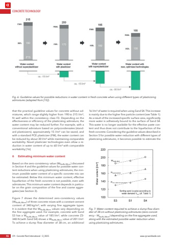 CONCRETE TECHNOLOGY46 CPI %u2013 Concrete Plant International %u2013 5 | 2025 www.cpi-worldwide.comthat the practical guideline values for concrete without admixtures, which range slightly higher from 190 to 215 l/m%u00b3, fit well within the consistency class F3. Depending on the effectiveness or efficiency of the plasticizing admixture, the water content may be reduced further. For example, with a conventional admixture based on polycondensates (standard plasticizers), approximately 15 l/m%u00b3 can be saved, and with a standard PCE plasticizer (FM), the water content can be reduced by about 30 l/m%u00b3 while maintaining comparable workability. Novel plasticizer technologies even allow a reduction in water content of up to 60 l/m%u00b3 with comparable workability [16].6 Estimating minimum water contentBased on the zero-consistency value (WNullk,38cm) discussed in Section 4 and the guideline values for possible water content reductions when using plasticizing admixtures, the minimum possible water content of a specific concrete mix can be estimated. Below this minimum water content, effective liquefaction of the fresh concrete is not possible, even with admixtures. This minimum water content depends in particular on the grain composition of the fine and coarse aggregates (see Section 3).Figure 7 shows the determined zero-consistency values (WNullk,38cm) of three concrete mixes with a constant cement content of 340 kg/m%u00b3, with varying fine aggregate types. It is evident that the WNullk,38cm values vary depending on the fine aggregate used. For example, concrete with Sand S3 has a WNullk,38cm value of 185 l/m%u00b3, while concrete Z3-340-N (with Sand S4) shows a WNullk,38cm value of 201 l/m%u00b3.To achieve a slump flow diameter of 38 cm, an additional 16 l/m%u00b3 of water is required when using Sand S4. This increase is mainly due to the higher fine particle content (see Table 1). As a result of the increased specific surface area, significantly more water is adhesively bound to the surface of Sand S4. This water is no longer available for the effective paste content and thus does not contribute to the liquefaction of the fresh concrete. Considering the guideline values described in Section 5 for possible water reduction with different types of plasticizing admixtures, it becomes possible to estimate the Fig. 6: Guideline values for possible reductions in water content in fresh concrete when using different types of plasticizing admixtures (adapted from [15]).Fig. 7: Water content required to achieve a slump flow diameter of 38 cm without plasticizing admixtures (zero-consistency - WNullk,38cm) depending on the fine aggregate used, along with the estimated possible water reduction when using plasticizing admixtures.