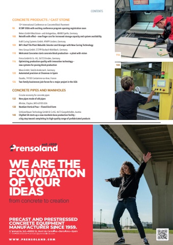 CONTENTSCONCRETE PRODUCTS / CAST STONE13th International Conference on Concrete Block Pavement98%u0009 ICCBP 2026 with exciting conference program opening registration soonRekers GmbH Maschinen- und Anlagenbau, 48480 Spelle, Germany 100%u0009 Retrofit with effect %u2013 new finger cars for increased storage capacity and system availabilityKraft Curing Systems GmbH, 49699 Lindern, Germany104%u0009 IBF%u2019s Roof Tile Plant Rebuilds Smarter and Stronger with New Curing TechnologyHess Group GmbH, 57299 Burbach-Wahlbach, Germany110%u0009 Mehramat Concretes starts concrete block production %u2013 a plant with visionFrima GmbH & Co. KG, 26723 Emden, Germany116%u0009 Optimizing production quality with innovative technology %u2013new systems for paving block productionMasa GmbH, 56626 Andernach, Germany 120%u0009 Automated precision at Cleannox in SpainQuadra, 74130 Contamine-sur-Arve, France126%u0009 Two family businesses join forces for a major project in the USACONCRETE PIPES AND MANHOLESCircular economy for concrete pipes132%u0009 New pipes made of old pipesAfinitas, Clayton, MO 63105 USA138%u0009 NextGen Vertical Pour %u2013 Flared End FormSchl%u00fcsselbauer Technology GmbH & Co KG, 4673 Gaspoltshofen, Austria140%u0009 Chy%u017ebet SK starts up a new manhole base production facility %u2013a big step toward completing its high-quality range of prefabricated productsfrom concrete to creationWE ARE THEFOUNDATIONOF YOURIDEASWWW PRENSOLAND COM116140