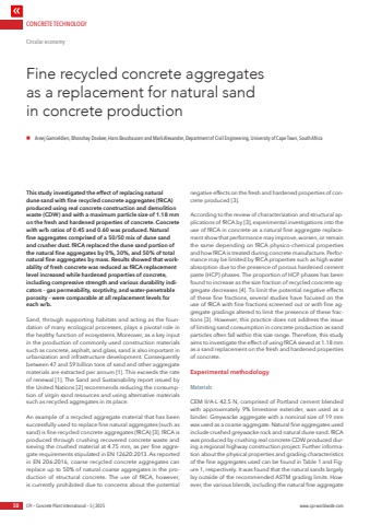 CONCRETE TECHNOLOGY50 CPI %u2013 Concrete Plant International %u2013 5 | 2025 www.cpi-worldwide.comThis study investigated the effect of replacing natural dune sand with fine recycled concrete aggregates (fRCA) produced using real concrete construction and demolition waste (CDW) and with a maximum particle size of 1.18 mm on the fresh and hardened properties of concrete. Concrete with w/b ratios of 0.45 and 0.60 was produced. Natural fine aggregates comprised of a 50/50 mix of dune sand and crusher dust. fRCA replaced the dune sand portion of the natural fine aggregates by 0%, 30%, and 50% of total natural fine aggregates by mass. Results showed that workability of fresh concrete was reduced as fRCA replacement level increased while hardened properties of concrete, including compressive strength and various durability indicators - gas permeability, sorptivity, and water-penetrable porosity - were comparable at all replacement levels for each w/b. Sand, through supporting habitats and acting as the foundation of many ecological processes, plays a pivotal role in the healthy function of ecosystems. Moreover, as a key input in the production of commonly used construction materials such as concrete, asphalt, and glass, sand is also important in urbanization and infrastructure development. Consequently between 47 and 59 billion tons of sand and other aggregate materials are extracted per annum [1]. This exceeds the rate of renewal [1]. The Sand and Sustainability report issued by the United Nations [2] recommends reducing the consumption of virgin sand resources and using alternative materials such as recycled aggregates in its place. An example of a recycled aggregate material that has been successfully used to replace fine natural aggregates (such as sand) is fine recycled concrete aggregates (fRCA) [3]. fRCA is produced through crushing recovered concrete waste and sieving the crushed material at 4.75 mm, as per fine aggregate requirements stipulated in EN 12620:2013. As reported in EN 206:2016, coarse recycled concrete aggregates can replace up to 50% of natural coarse aggregates in the production of structural concrete. The use of fRCA, however, is currently prohibited due to concerns about the potential negative effects on the fresh and hardened properties of concrete produced [3]. According to the review of characterization and structural applications of fRCA by [3], experimental investigations into the use of fRCA in concrete as a natural fine aggregate replacement show that performance may improve, worsen, or remain the same depending on fRCA physico-chemical properties and how fRCA is treated during concrete manufacture. Performance may be limited by fRCA properties such as high water absorption due to the presence of porous hardened cement paste (HCP) phases. The proportion of HCP phases has been found to increase as the size fraction of recycled concrete aggregate decreases [4]. To limit the potential negative effects of these fine fractions, several studies have focused on the use of fRCA with fine fractions screened out or with fine aggregate gradings altered to limit the presence of these fractions [3]. However, this practice does not address the issue of limiting sand consumption in concrete production as sand particles often fall within this size range. Therefore, this study aims to investigate the effect of using fRCA sieved at 1.18 mm as a sand replacement on the fresh and hardened properties of concrete. Experimental methodologyMaterialsCEM II/A-L 42.5 N, comprised of Portland cement blended with approximately 9% limestone extender, was used as a binder. Greywacke aggregate with a nominal size of 19 mm was used as a coarse aggregate. Natural fine aggregates used include crushed greywacke rock and natural dune sand. fRCA was produced by crushing real concrete CDW produced during a regional highway construction project. Further information about the physical properties and grading characteristics of the fine aggregates used can be found in Table 1 and Figure 1, respectively. It was found that the natural sands largely lay outside of the recommended ASTM grading limits. However, the various blends, including the natural fine aggregate Fine recycled concrete aggregates as a replacement for natural sand in concrete production Circular economy n Areej Gamieldien, Bhooshay Dookee, Hans Beushausen and Mark Alexander, Department of Civil Engineering, University of Cape Town, South Africa