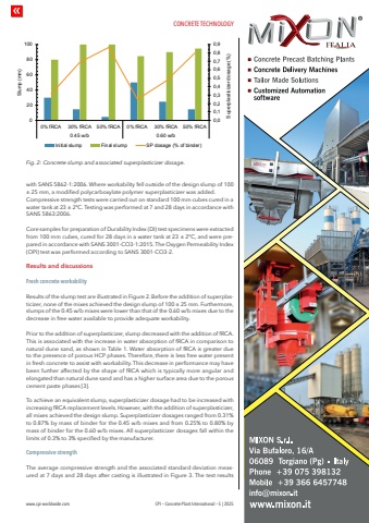 CONCRETE TECHNOLOGYwww.cpi-worldwide.com CPI %u2013 Concrete Plant International %u2013 5 | 2025with SANS 5862-1:2006. Where workability fell outside of the design slump of 100 %u00b1 25 mm, a modified polycarboxylate polymer superplasticizer was added. Compressive strength tests were carried out on standard 100 mm cubes cured in a water tank at 23 %u00b1 2%u00baC. Testing was performed at 7 and 28 days in accordance with SANS 5863:2006. Core samples for preparation of Durability Index (DI) test specimens were extracted from 100 mm cubes, cured for 28 days in a water tank at 23 %u00b1 2%u00baC, and were prepared in accordance with SANS 3001-CO3-1:2015. The Oxygen Permeability Index (OPI) test was performed according to SANS 3001-CO3-2. Results and discussions Fresh concrete workability Results of the slump test are illustrated in Figure 2. Before the addition of superplasticizer, none of the mixes achieved the design slump of 100 %u00b1 25 mm. Furthermore, slumps of the 0.45 w/b mixes were lower than that of the 0.60 w/b mixes due to the decrease in free water available to provide adequate workability. Prior to the addition of superplasticizer, slump decreased with the addition of fRCA. This is associated with the increase in water absorption of fRCA in comparison to natural dune sand, as shown in Table 1. Water absorption of fRCA is greater due to the presence of porous HCP phases. Therefore, there is less free water present in fresh concrete to assist with workability. This decrease in performance may have been further affected by the shape of fRCA which is typically more angular and elongated than natural dune sand and has a higher surface area due to the porous cement paste phases [3]. To achieve an equivalent slump, superplasticizer dosage had to be increased with increasing fRCA replacement levels. However, with the addition of superplasticizer, all mixes achieved the design slump. Superplasticizer dosages ranged from 0.31% to 0.87% by mass of binder for the 0.45 w/b mixes and from 0.25% to 0.80% by mass of binder for the 0.60 w/b mixes. All superplasticizer dosages fall within the limits of 0.3% to 3% specified by the manufacturer. Compressive strength The average compressive strength and the associated standard deviation measured at 7 days and 28 days after casting is illustrated in Figure 3. The test results fifffififffflfiffffififfflfiff%u001afiff%u0019fiff%u0018fiff%u0017fiff%u0016fiff%u0015fiffifi%u001afi%u0018fi%u0016fifflfififi%u0014%u0013%u0012%u0011%u0010%u000f flfi%u0014%u0013%u0012%u0011%u0010%u000f %u0019fi%u0014%u0013%u0012%u0011%u0010%u000f fi%u0014%u0013%u0012%u0011%u0010%u000f flfi%u0014%u0013%u0012%u0011%u0010%u000f %u0019fi%u0014%u0013%u0012%u0011%u0010%u000ffi%u000e%u001a%u0019%u0013%u000c%u000b fi%u000e%u0018fi%u0013%u000c%u000b%u0009%u0008%u0007%u0006%u0008%u0005%u0004%u0003%u0001%u0001%u0081%u0007%u0006%u0013%u008d%u008f%u0003%u0004%u0090%u0007%u0013%u009d%u0014%u00a0 %u0005%u0009%u00ad%u0008%u0013%u009d%u00ad%u00ad%u00a0%u0080%u0082%u0001%u0001%u0004%u0005%u0013%u0003%u0005%u0009%u00ad%u0008 %u0083%u0001%u0082%u0004%u0005%u0013%u0003%u0005%u0009%u00ad%u0008 %u0084%u0013%u008d%u008f%u0003%u0004%u0090%u0007%u0013%u009d%u0014%u0013%u008f%u0012%u0013%u000b%u0001%u0082%u008d%u0007%u0006%u00a0Fig. 2: Concrete slump and associated superplasticizer dosage.