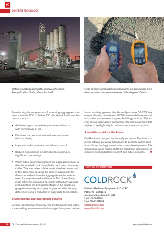 CONCRETE TECHNOLOGY64 CPI %u2013 Concrete Plant International %u2013 5 | 2025 www.cpi-worldwide.comBy reducing the temperature of incoming aggregates from approximately 45%u00b0C to below 5%u00b0C, the Hydro-Spiral enables contractors to:%u2022 Achieve target concrete temperatures without or with minimal use of ice.%u2022 Eliminate the production slowdowns associated with ice dosing.%u2022 Improve batch consistency and slump control.%u2022 Reduce dependence on admixtures, resulting in significant cost savings.%u2022 Warm silted water coming from the aggregates cooler is directly recycled back through the dedicated dirty water chiller. This specialised chiller cools the silted water and at the same time keeping the fines in suspension for direct re-use back into the aggregates cooler without need for any intermediate filtration. This closed loop cycle efficiently manages the water without any wastage and maintains the fines percentages in the coarse aggregates meaning what goes in goes out with the only difference being a reduction in aggregate temperature.Environmental and operational benefitsBeyond operational efficiency, the Hydro-Spiral also offers a compelling environmental advantage. Compared to icebased cooling systems, the Hydro-Spiral uses 50%u201370% less energy, aligning directly with NEOM%u2019s sustainability goals and its broader commitment to green building practices. This energy-saving approach is particularly relevant in a project that aspires to lead globally in carbon-conscious construction.A scalable model for the futureColdRock, encouraged by the early success at The Line project, is actively pursuing discussions to promote wider adoption of its technology across other major developments. This momentum could mark a shift from traditional approaches to concrete cooling, both for current and future projects. nFURTHER INFORMATIONColdRock %u2013 Mechanical Equipment %u2013 L.L.C. %u2013 S.P.C.Plot No. 92 %u2013 Unit No. 15Abu Dhabi %u2013 Musaffah %u2013 M-11, UAET +971 50 1803103T +49 5704 3289988info@coldrock-llc.comwww.coldrock-llc.com80-ton insulated aggregates cold weighing silo, ReadyMix Abu Dhabi, Mena Port UAE.Fresh concrete production temperatures are achievable even when ambient temperature exceed 40+ degrees Celsius.
