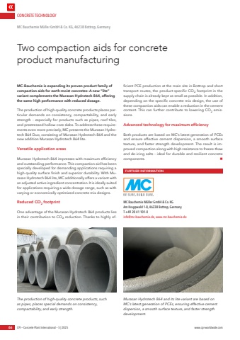 CONCRETE TECHNOLOGY66 CPI %u2013 Concrete Plant International %u2013 5 | 2025 www.cpi-worldwide.comMC-Bauchemie is expanding its proven product family of compaction aids for earth-moist concretes: A new %u201clite%u201d variant complements the Murasan Hydrotech 864, offering the same high performance with reduced dosage.The production of high-quality concrete products places particular demands on consistency, compactability, and early strength %u2013 especially for products such as pipes, roof tiles, and prestressed hollow-core slabs. To address these requirements even more precisely, MC presents the Murasan Hydrotech 864 Duo, consisting of Murasan Hydrotech 864 and the new addition Murasan Hydrotech 864 lite.Versatile application areasMurasan Hydrotech 864 impresses with maximum efficiency and outstanding performance. This compaction aid has been specially developed for demanding applications requiring a high-quality surface finish and superior durability. With Murasan Hydrotech 864 lite, MC additionally offers a variant with an adjusted active ingredient concentration. It is ideally suited for applications requiring a wide dosage range, such as with varying or economically optimized concrete mix designs.Reduced CO2 footprintOne advantage of the Murasan Hydrotech 864 products lies in their contribution to CO2 reduction. Thanks to highly efficient PCE production at the main site in Bottrop and short transport routes, the product-specific CO2 footprint in the supply chain is already kept as small as possible. In addition, depending on the specific concrete mix design, the use of these compaction aids can enable a reduction in the cement content. This can further contribute to lowering CO2 emissions.Advanced technology for maximum efficiencyBoth products are based on MC%u2019s latest generation of PCEs and ensure effective cement dispersion, a smooth surface texture, and faster strength development. The result is improved compaction along with high resistance to freeze-thaw and de-icing salts %u2013 ideal for durable and resilient concrete components. nTwo compaction aids for concrete product manufacturingMC Bauchemie M%u00fcller GmbH & Co. KG, 46238 Bottrop, GermanyFURTHER INFORMATIONMC Bauchemie M%u00fcller GmbH & Co. KGAm Kruppwald 1-8, 46238 Bottrop, GermanyT +49 20 41 101-0info@mc-bauchemie.de, www.mc-bauchemie.deThe production of high-quality concrete products, such as pipes, places special demands on consistency, compactability, and early strength.Murasan Hydrotech 864 and its lite variant are based on MC%u2019s latest generation of PCEs, ensuring effective cement dispersion, a smooth surface texture, and faster strength development.