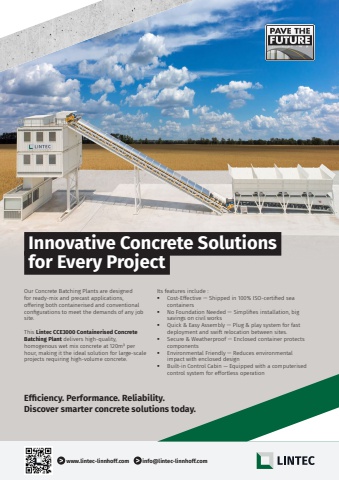 www.lintec-linnhoff.com info@lintec-linnhoff.com Innovative Concrete Solutions for Every Project Our Concrete Batching Plants are designed for ready-mix and precast applications, offering both containerised and conventional configurations to meet the demands of any job site.This Lintec CCE3000 Containerised Concrete Batching Plant delivers high-quality, homogenous wet mix concrete at 120m%u00b3 per hour, making it the ideal solution for large-scale projects requiring high-volume concrete.Efficiency. Performance. Reliability. Discover smarter concrete solutions today.Its features include :%u0083 Cost-Effective %u2014 Shipped in 100% ISO-certified sea containers%u0083 No Foundation Needed %u2014 Simplifies installation, big savings on civil works%u0083 Quick & Easy Assembly %u2014 Plug & play system for fast deployment and swift relocation between sites.%u0083 Secure & Weatherproof %u2014 Enclosed container protects components%u0083 Environmental Friendly %u2014 Reduces environmental impact with enclosed design%u0083 Built-in Control Cabin %u2014 Equipped with a computerised control system for effortless operation
