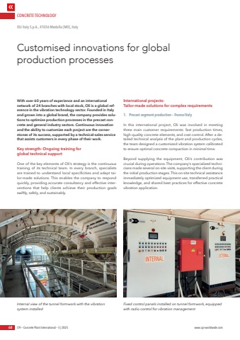 CONCRETE TECHNOLOGY68 CPI %u2013 Concrete Plant International %u2013 5 | 2025 www.cpi-worldwide.comWith over 60 years of experience and an international network of 24 branches with local stock, Oli is a global reference in the vibration technology sector. Founded in Italy and grown into a global brand, the company provides solutions to optimize production processes in the precast concrete and general industry sectors. Continuous innovation and the ability to customize each project are the cornerstones of its success, supported by a technical-sales service that assists customers in every phase of their work.Key strength: Ongoing training for global technical supportOne of the key elements of Oli%u2019s strategy is the continuous training of its technical team. In every branch, specialists are trained to understand local specificities and adapt tailor-made solutions. This enables the company to respond quickly, providing accurate consultancy and effective interventions that help clients achieve their production goals swiftly, safely, and sustainably.International projects: Tailor-made solutions for complex requirements1.%u0009 Precast segment production %u2013 France/ItalyIn this international project, Oli was involved in meeting three main customer requirements: fast production times, high-quality concrete elements, and cost control. After a detailed technical analysis of the plant and production cycles, the team designed a customized vibration system calibrated to ensure optimal concrete compaction in minimal time.Beyond supplying the equipment, Oli%u2019s contribution was crucial during operations. The company's specialized technicians made several on-site visits, supporting the client during the initial production stages. This on-site technical assistance immediately optimized equipment use, transferred practical knowledge, and shared best practices for effective concrete vibration application.Customised innovations for global production processesOLI Italy S.p.A., 41036 Medolla (MO), ItalyInternal view of the tunnel formwork with the vibration system installedFixed control panels installed on tunnel formwork, equipped with radio control for vibration management