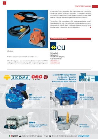 CONCRETE TECHNOLOGYwww.cpi-worldwide.com CPI %u2013 Concrete Plant International %u2013 5 | 2025 71And it is in this context that Oli raised the bar.It has developed a new pneumatic vibrator certified for ATEX underground environments, capable of operating safely even in the most critical situations. But that%u2019s not all: Oli can supply the entire system, offering customers a complete, reliable, and ready-to-use solution that allows continuous, safe work even in the most demanding environmental conditions.To reinforce this commitment, Oli is always available to collaborate directly with clients and partners to assess each project%u2019s specific needs, best integrate vibration systems, and provide solid, continuous technical support. nFURTHER INFORMATIONOLI Italy S.p.A.Via Sparato, 1441036 Medolla (MO), ItalyT +39 0535 410 611info@olivibra.itwww.olivibra.comVibrators