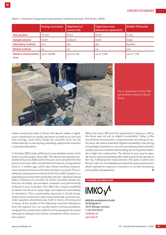 CONCRETE TECHNOLOGYwww.cpi-worldwide.com CPI %u2013 Concrete Plant International %u2013 5 | 2025 81entire construction sites in Korea, the device makes a significant contribution to quality assurance as well as to cost and time savings, since every ready-mix concrete truck can be tested directly on site during unloading, without the need for a concrete laboratory.In October 2025, Imko will launch a new wireless version of its fresh concrete probe, Sono WZ. The device was already presented at bauma 2025 earlier this year and complements the previous solution with comprehensive features and graphical tools in a mobile app, which also allows sending measurement values with time and location stamps to a cloud. The underlying measurement method of the Sono WZ is based on a patented procedure that generates precise individual values within a fraction of a second. An entire concrete sample can thus be recorded, documented, analyzed, and permanently archived in just 2 minutes. This offers the unique possibility to detect trends at an early stage and respond immediately to deviations. This is particularly important in South Korea, where some construction sites must coordinate up to ten concrete suppliers simultaneously, both in terms of timing and in terms of the quality of the delivered concrete. Deviations from the agreed mix can quickly lead to serious problems, ranging from construction defects and subsequent structural damage to collapse even before completion of the construction project.When the Sono WZ was first presented at bauma in 2016, the focus was not yet on digital connectivity. Today, in the era of Smart Construction, comprehensive recording of construction site data is essential. Digital traceability is becoming increasingly important in concrete processing, particularly for quality assurance and the demanding use of recycled materials in high-rise construction. The device is very easy to operate and is used immediately after entering the bulk density of the mix. Following the measurement, the water content and the w/c ratio are immediately provided as output parameters, which represents a genuine innovation in on-site monitoring and quality management. nFURTHER INFORMATIONIMKO Micromodultechnik GmbHAm Reutgraben 276275 Ettlingen, GermanyT +49 7243 59210info@imko.dewww.imko.deFig. 2: Application of the TDR penetration method in South Korea.Table 1: Overview of approved measurement methods (excerpt; Park & Han, 2022)Drying, microwave Digitalised air content testCapacitance test (laboratory equipment)Mobile TDR probeTest duration 15 min 8 min 8 min 2 minSample volume small medium small largeLaboratory method yes yes yes flexibleMobile method no no no yesRelative measurement error up to 30,8% up to 2,1% up to 9,4% up to 1,1%
