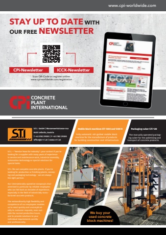 Mobile block machines STI 1200 and 1200 HFully automatic rail-guided mobile block machine for the manufacture of products for building construction and infrastructure.Packaging cuber STI 120The manually operated packag - ing cuber for the palletising and transport of concrete products.S.T.I. %u2013 \looking for a supplier with many years of experience in service and maintenance work, industrial assembly, automation technology or special solutions for special tasks.S.T.I. fits out complete concrete plants. If you're looking for production or finishing plants, conveying and packaging technology %u2013 we are always the right partner.Our internationally operative companyis characterised in particular by reliable employees who can fall back on decades of experience, especially in the field of industrially manufactured concrete products.The extraordinarily high flexibility and competence of our employees enables us to react quickly and uncomplicatedly to customer requests, even outside the normal production hours, and to pro vide solutions to your individual requirements quickly and profes sionally.S.T.I. GmbH | Wasserwerkstrasse 44a 8430 Leibnitz, AustriaT +43 3182 29305 | F +43 3182 29300 office@s-t-i.at | www.s-t-i.atWe buy your used concrete block machines!www.cpi-worldwide.comSTAY UP TO DATE WITH OUR FREE NEWSLETTERScan QR-Code or register online: www.cpi-worldwide.com/registrationCPi-Newsletter ICCX-NewsletterCONCRETE PLANTINTERNATIONALTRADE JOURNALS FOR THE CONCRETE INDUSTRY