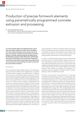 90 CPI %u2013 Concrete Plant International %u2013 5 | 2025 www.cpi-worldwide.comFor many decades, Wasa has emphasised close contact with universities, institutes and other research facilities, not only to further develop its own products, but also to gain new impulses and ideas for future trends. A research project is currently underway between the Wasa Group, the Steinbeis Innovation Centre FiberCrete and Chemnitz University of Technology for the production of high-precision formwork elements using parametrically programmed concrete extrusion and processing. This report summarises the current state of research.IntroductionThe worsening shortage of skilled workers in the building industry and the associated need for digitalisation are present and future tasks in research and development. In addition, the construction and building industry continues to emit record amounts of greenhouse gases and is therefore still failing to meet the targets of the Paris Climate Agreement. The sector is now responsible for 37 per cent of global CO2emissions [1]. In order to reduce emissions, sustainability in the construction industry must be increased. On the one hand, this can be achieved by substituting CEM I cement with more climate-friendly cement. On the other hand, the efficient use of materials, a force flow-orientated construction method and the reuse of recycled waste materials are also enormous options for reducing the industry's CO2emissions. On this basis, additive manufacturing processes can potentially become the key technology of the future building industry. The 3D printing of concrete is characterised by a high degree of design freedom, which in turn benefits the saving of unique and complex formwork as well as the design of components according to force flow and thus material savings. The high degree of automation possible with this type of production will counteract the shortage of skilled labour in the future. In many applications, however, the layered surface structuring that occurs when the concrete is printed is undesirable. In the current state of research, the printed concrete is milled in the hardened state, which in turn results in high tool wear, low milling speeds and relatively low material removal [2]. In order to avoid these disadvantages, the processing of the printed concrete in the fresh state has largely come to the fore. High-quality and geometrically complex precast concrete elements represent a major area of current trend in the building industry [3]. Another current trend that will expand enormously in the future is the functionalisation of concrete elements. This includes, for example, the integration of a heating function, the integration of LEDs for direct or indirect lighting or other electrified functions [4].The focus of this research is the production of a new type of flexible formwork element which, in combination with conventional formwork elements, enables the production of complex-shaped precast concrete elements without demoulding bevels or with local undercuts. To produce the flexible elements, a mineral-bonded material is printed close to the final contour. It is then processed in the fresh state and finally milled to the final contour after hardening. The model is moulded with a casting resin. The resulting flexible formwork element produces the concrete part with undercuts. The printed and milled model can then be recycled and returned to the material circulation. Resource efficiency and sustainability take centre stage, which is why the technology is to be used primarily in prototyping and small series production to replace established conventional state-of-the-art processes such as environmentally harmful milling from solid polystyrene material. There is great potential for saving resources in mould construction due to the individuality of the components.Production of precise formwork elements using parametrically programmed concrete extrusion and processingWasa AG, 64293 Darmstadt, Germanyn Dr Arno Schimpf, Wasa AG, GermanyMarvin Absto%u00df, M.Sc., Dipl.-Ing. Henrik Funke Steinbeis Innovation Centre FiberCrete, GermanyProf. Dr.-Ing. habil. Sandra Gelbrich, TU Chemnitz, Germany