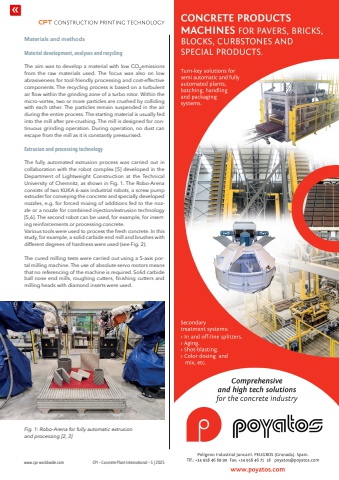 www.cpi-worldwide.com CPI %u2013 Concrete Plant International %u2013 5 | 2025Materials and methodsMaterial development, analyses and recyclingThe aim was to develop a material with low CO2emissions from the raw materials used. The focus was also on low abrasiveness for tool-friendly processing and cost-effective components. The recycling process is based on a turbulent air flow within the grinding zone of a turbo rotor. Within the micro-vortex, two or more particles are crushed by colliding with each other. The particles remain suspended in the air during the entire process. The starting material is usually fed into the mill after pre-crushing. The mill is designed for continuous grinding operation. During operation, no dust can escape from the mill as it is constantly pressurised. Extrusion and processing technologyThe fully automated extrusion process was carried out in collaboration with the robot complex [5] developed in the Department of Lightweight Construction at the Technical University of Chemnitz, as shown in Fig. 1. The Robo-Arena consists of two KUKA 6-axis industrial robots, a screw pump extruder for conveying the concrete and specially developed nozzles, e.g. for forced mixing of additions fed to the nozzle or a nozzle for combined injection/extrusion technology [5,6]. The second robot can be used, for example, for inserting reinforcements or processing concrete.Various tools were used to process the fresh concrete. In this study, for example, a solid carbide end mill and brushes with different degrees of hardness were used (see Fig. 2).The cured milling tests were carried out using a 5-axis portal milling machine. The use of absolute servo motors means that no referencing of the machine is required. Solid carbide ball nose end mills, roughing cutters, finishing cutters and milling heads with diamond inserts were used.Fig. 1: Robo-Arena for fully automatic extrusion and processing [2, 3]