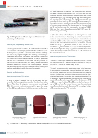 92 CPI %u2013 Concrete Plant International %u2013 5 | 2025 www.cpi-worldwide.comPlanning and programming of robot pathsGrasshopper, an add-on to the CAD software Rhinoceros%u00ae, is used to create extrusion programmes for the control and production planning of KUKA 6-axis industrial robots. Grasshopper is a visual programming tool for creating parametric geometries in Rhinoceros. The results are controlled algorithms that describe or define the geometries. KUKA|prc generates the final robot commands on this basis. The programmes for the extrusion and subsequent processing of near-net-shape elements essentially consist of the following steps: Creating the geometry or preparing the target geometry, creating the path curves and generating the robot commands.Results and discussionMaterial properties and CO2 savingsIn order to obtain a material that can be extruded and processed at the lowest possible cost, the Steinbeis Innovation Centre FiberCrete developed a microconcrete consisting of CEM III/A cement, a mineral powder with a grain size range of 0 to 200 %u00b5m, admixtures (stabiliser, primary and secondary superplasticiser) and water. The superplasticiser enables the water content to be reduced and, in conjunction with the stabiliser, ensures a more uniform mixture that is less prone to sedimentation. In a first mixing step, the solid raw materials are mixed for 140 seconds. The liquid raw materials are added and mixed again for 320 seconds. This two-stage mixing regime ensures complete mixing of the components into a homogeneous material. The slump could be characterised as 13 cm. Furthermore, the compressive strength of 40.01 MPa and the 4-point flexural strength of 6.01 MPa were determined experimentally.A CEM III/A with a volume fraction of 520 kg/m%u00b3 was used in the concrete mixture. According to current research, this recipe is comparable to a similar concrete mixture that was used with a CEM I with a volume fraction of 600 kg/m%u00b3 [2]. The value for the cement clinker emissions of Portland cement CEM I is 875 kg CO2/t cement clinker [7]. For CEM III/A cement, the CO2 emissions are 543.8 kg/t of cement [8]. This results in a saving of 282.8 kg CO2 per cubic metre of concrete used. This corresponds to a reduction of 46.1 % in relation to the cement emissions.Near-net-shape extrusion of the concreteThe aim of this study is the additive manufacturing of a model for the production of a flexible formwork element for the production of a planter as shown in Fig. 3, left.Through various extrusion tests to generate initial samples, it was possible to determine essential settings with regard to the printing speed as a function of throughput and material system. Furthermore, settings and parameters could be characterised with regard to starting and stopping behaviour. This is necessary to enable seamless extrusion of the material and avoid defects. Extrusion is possible with a die diameter of 10 to 25 mm, a layer height of 5 to 20 mm and a feed speed of up to 720 mm/min. The model element was then additively manufactured with a nozzle diameter of 20 mm, a layer height of 5 mm and a speed of 720 mm/min.Demonstrator with undercut for holding LED stripsFlexible formwork element with wooden coreModel elements structurally derived from the coreSingle model element for extrusion and millingFig. 3: Procedure for removing the formwork elements required to manufacture the demonstratorFig. 2: Milling heads of different degrees of hardness for processing fresh concrete