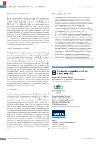 94 CPI %u2013 Concrete Plant International %u2013 5 | 2025 www.cpi-worldwide.comRecycling and reuse of the materialThe pre-shredded material was recycled using a turbo rotor. The resulting grain size distribution of the recycled material (0.05 % 160 %u00b5m, 1.45 % 90 - 160 %u00b5m, 10.5 % 45-90 %u00b5m, 3 % 32-45 %u00b5m, 95 % < 32 %u00b5m) is similar to the grain size distribution of the mineral flour used. This meant that the mineral flour could be replaced by the crushed recycled material, while the proportions of the other components were kept constant. Eligibility for extrusion was achieved up to a substitution rate of 50%. Characterisation of the compressive and flexural strength was carried out for substitution rates of 25, 50, 75 and 100 %. These strengths deviated by a maximum of 10 % from those of the original concrete recipe. This is an indication of the successful reuse of the recycled material and the realisation of a material circulation.Outlook - Demonstrator productionTo apply the technology, the planter is manufactured using the concrete casting process. Firstly, the outer formwork elements are produced conventionally from GRP. On the other hand, the core is produced using the near-net-shape extrusion technology developed as part of this research with subsequent milling in the fresh and hardened state. The model for moulding the core with a casting resin is quartered for production reasons. The extrusion and milling of a model element in the fresh state has already been successfully completed (see Figs. 4 and 6). In the further course of research, the model is milled into the final contour in the hardened state. The model is then moulded in a casting resin. A wooden core is fixed inside the mould element, which can be removed from the casting resin in a first step during demoulding. The thin-walled, flexible formwork element can then be easily demoulded, eliminating the need for a demoulding bevel and allowing the undercut to be produced.ConclusionsIn this research work, the successful development of an additive process for the sustainable production of a new formwork based on concrete extrusion and milling was demonstrated. A new fine concrete mixture with CEM III/A was developed and characterised, which enables processing in the fresh and hardened state. After the concrete elements have been extruded, they are shaped into their final form by brushing and milling. The new combined technology enables the resource-efficient and digitalised production of complex models without demoulding bevels and with local undercuts. After use as formwork, the recycling process of the concrete elements is continued and the recycled material is fed back into the printing process. The result is a complex technology consisting of the following steps: near-net-shape extrusion, brushing and milling in the fresh and hardened state, moulding with casting resin, production of precast concrete parts, recycling of concrete models, reuse for additive manufacturing. nBibliography & footnotes1. United Nations Environment Programme (2022). 2022 Global Status Report for Buildings and Construction: Towards a Zero-emission, Efficient and Resilient Buildings and Construction Sector. Nairobi2. S. Gelbrich, M. Absto%u00df, H. Funke: Complex concrete elements for the production of recyclable formwork by extrusion and milling, December 2023, ce/papers 6(6):729-734, DOI: 10.1002/cepa.2815 3. M. Absto%u00df, E. Rudolph, H. Funke, S. Gelbrich (2021) 3D printing and milling of complex concrete elements for the production of casting resin molds. In: CPT worldwide - construction printing technology, 2021. CPT Worldwide, Nr.: 2, 2021, S.14-20, ISSN 2629-15924. Gliniorz, R.: Energy-Efficient Reinforced Heating System Implemented as a Carbon Concrete Formwork. Springer Nature Switzerland AG 2023 Z. Zembaty et al. (Eds.): ECCE 2022, LNCE 322, pp. 258%u2013272, 20235. Lindner, M.; Scharf-Wildenhain, R.; Gliniorz, R.; Vanselow, K.; Funke, H.; Gelbrich, S.; Kroll, L. (2021) Kalibrierverfahren f%u00fcr konstante Materialstr%u00e4nge bei robotergest%u00fctzter Betonextrusion. Beton- und Stahlbetonbau 116, Sonderheft Schneller Bauen, 116, Ernst & Sohn 2021, pp. 42-47, ISSN 1437-1006. https://doi.org/10.1002/best.2021000516. Lindner, M.; Mandel, K.; Gelbrich, S.; Funke, H.; Kroll, L. (2021) Kontinuierliche Fertigung von d%u00fcnnwandigen faserverst%u00e4rkten Pr%u00e4zisions-Betonelementen f%u00fcr freigeformte Mo-dulbauweisen (KoBeMo). BetonWerk International Nr. 1, 2021, pp. 28-29, ISSN 1437-9023.chttps://www.cpi-worldwide.com/images/cpi/flips/2021/1/en/index.html?#p=28 7. Verein Deutscher Zementwerke e.V: Umwelt-Produktdeklaration - Portlandzement (CEM I), EPD-VDZ-20220153-IAG1-DE, 08.06.2022 8. Verein Deutscher Zementwerke e.V: Umwelt-Produktdeklaration - Hochofenzement (CEM III/A), EPD-VDZ-20220154-IAG1-DE, 09.06.2022FURTHER INFORMATIONSteinbeis Innovation Centre FiberCreteOtto-Schmerbach-Str. 19, Hall 12, 09117 Chemnitz, Germanysu1612@stw.de, www.fibercrete.deTechnical University of ChemnitzInstitute for Lightweight StructuresDepartment of Lightweight ConstructionReichenhainer Str. 33, Room 00809126 Chemnitz, Germanywww.leichtbau.tu-chemnitz.de/research-area/lbw/WASA AG Europaplatz 4, 64293 Darmstadt, Germany T +49 6151 7808500 info@wasa-technologies.comwww.wasa-technologies.com