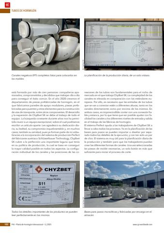 TUBOS DE HORMIG%u00d3N102 PHI %u2013 Planta de Hormig%u00f3n Internacional %u2013 5 | 2025 www.cpi-worldwide.comest%u00e1 formado por m%u00e1s de cien personas: compa%u00f1eros apasionados, comprometidos y decididos que trabajan d%u00eda a d%u00eda para conseguir el %u00e9xito com%u00fan. En el a%u00f1o 2020 creamos el departamento de piezas prefabricadas de hormig%u00f3n, en el que fabricamos paredes de apoyo modulares, piezas prefabricadas para puentes y otros elementos para la construcci%u00f3n de v%u00edas de transporte, entre otros componentes. El desarrollo y la expansi%u00f3n de Chy%u017ebet SK se debe al trabajo de todo el equipo. La b%u00fasqueda constante durante a%u00f1os nos ha permitido reunir a un equipo excepcional, sobre el cual podr%u00edamos escribir un art%u00edculo aparte. Les agradezco su dedicaci%u00f3n diaria, su lealtad, su compromiso inquebrantable y, en muchos casos, tambi%u00e9n su amistad, pues ya forman parte de mi vida%u00bb.Gracias a la incorporaci%u00f3n del sistema de producci%u00f3n Perfect del fabricante austriaco Schl%u00fcsselbauer Technology, Chy%u017ebet SK cubre a la perfecci%u00f3n una importante laguna que ten%u00eda en su pol%u00edtica de producci%u00f3n, la cual se basa en conseguir la mayor calidad posible en todos los aspectos. La configuraci%u00f3n individual de los canales y las posiciones de las conexiones de los tubos son fundamentales para el nicho de mercado en el que trabaja Chy%u017ebet SK. La complejidad de los canales es elevada en comparaci%u00f3n con los est%u00e1ndares europeos. Por ello, es necesario que las entradas de los tubos que se van a conectar est%u00e9n a diferentes alturas, tanto en los canales directamente como por encima de los mismos. En ambos casos, es imprescindible contar con una conexi%u00f3n fiable y estanca, por lo que tiene que ser posible ajustar con facilidad los canales a los diferentes niveles de entrada y salida en el trabajo de las f%u00e1bricas de hormig%u00f3n.El sistema Perfect ayuda a los trabajadores de Chy%u017ebet SK a llevar a cabo todos los procesos. Ya en la planificaci%u00f3n de las bases para pozos se pueden importar o dise%u00f1ar por separado todos los detalles de la ejecuci%u00f3n, y con tan solo un par de clics. El sistema es muy %u00fatil para la planificaci%u00f3n diaria de la producci%u00f3n y tambi%u00e9n para que los trabajadores puedan crear las diferentes formas de canales. Una vez seleccionadas las piezas de molde necesarias, un solo bot%u00f3n es m%u00e1s que suficiente para iniciar el proceso de corte. Canales negativos EPS completos listos para colocarlos en los moldesLa planificaci%u00f3n de la producci%u00f3n diaria, de un solo vistazo. Todos los detalles importantes de los productos se pueden leer perfectamente en los mismos.Bases para pozos monol%u00edticas y fabricadas por encargo en el almac%u00e9n %u00a9 Chy%u017ebet SK %u00a9 Chy%u017ebet SK