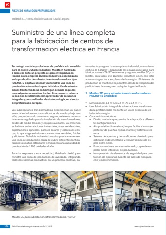 PIEZAS DE HORMIG%u00d3N PREFABRICADAS106 PHI %u2013 Planta de Hormig%u00f3n Internacional %u2013 5 | 2025 www.cpi-worldwide.comTecnolog%u00eda modular y soluciones de prefabricado a medida para el cliente Duhalde Industries: Moldtech ha llevado a cabo con %u00e9xito un proyecto de gran envergadura en Francia con la empresa Duhalde Industries, especializado en la producci%u00f3n de subestaciones transformadoras tipo PAC4UF. El objetivo: dise%u00f1ar y suministrar una l%u00ednea de producci%u00f3n automatizada para la fabricaci%u00f3n de subestaciones transformadoras en hormig%u00f3n armado seg%u00fan las muy exigentes normativas locales. Este proyecto refuerza la posici%u00f3n de Moldtech como proveedor de soluciones integrales y personalizadas de alta tecnolog%u00eda, en el sector del prefabricado europeo.Las subestaciones transformadoras desempe%u00f1an un papel esencial en infraestructuras el%u00e9ctricas de media y baja tensi%u00f3n, proporcionando un entorno seguro, resistente y normativamente regulado para la instalaci%u00f3n de transformadores, celdas de media tensi%u00f3n y equipos auxiliares. Su presencia es habitual en instalaciones industriales, %u00e1reas residenciales, explotaciones agr%u00edcolas, parques solares y estaciones e%u00f3licas, lo que exige soluciones constructivas vers%u00e1tiles, fiables y eficientes. Duhalde Industries buscaba precisamente eso: una l%u00ednea de producci%u00f3n capaz de cubrir diferentes configuraciones con altos est%u00e1ndares t%u00e9cnicos con una capacidad de producci%u00f3n de 1200 unidades al a%u00f1o.Para dar respuesta a esta necesidad, Moldtech dise%u00f1%u00f3 y suministr%u00f3 una l%u00ednea de producci%u00f3n de avanzada, integrando todos los sistemas productivos en un proceso continuo, automatizado y seguro. La nueva planta industrial, un moderno edificio de 5.000 m%u00b2, dispone de los equipos necesario para fabricar postes HTA/BT resistentes y seguros: moldes 3D, cubiertas, para losas, etc. Duhalde Industries opera con total autonom%u00eda gracias a su planta de hormig%u00f3n. El sistema de producci%u00f3n se mantiene bajo control, desde la recepci%u00f3n del pedido hasta la entrega en cualquier lugar de Francia. 1. Moldes 3D para subestaciones transformadoras PAC4UF (5 unidades)%u2022 Dimensiones: 3,6 m (L) x 3,1 m (A) x 2,4 m (H).%u2022 Uso: Fabricaci%u00f3n integral de subestaciones transformadoras prefabricadas mediante un %u00fanico proceso de colado de hormig%u00f3n.%u2022 Caracter%u00edsticas t%u00e9cnicas:%u2022 Dise%u00f1o modular que permite la adaptaci%u00f3n a diferentes configuraciones.%u2022 Alta precisi%u00f3n dimensional, lo que facilita el montaje posterior de puertas, rejillas, marcos y sistemas el%u00e9ctricos.%u2022 Sistema de apertura y cierre eficiente, dise%u00f1ado para optimizar el desencofrado y reducir tiempos de espera entre ciclos.%u2022 Estructura robusta en acero reforzado, capaz de soportar ciclos intensivos de producci%u00f3n.%u2022 Incorporaci%u00f3n de elementos de seguridad para protecci%u00f3n de operarios durante las fases de manipulaci%u00f3n y mantenimiento.Suministro de una l%u00ednea completa para la fabricaci%u00f3n de centros de transformaci%u00f3n el%u00e9ctrica en FranciaMoldtech S.L., 41500 Alcal%u00e1 de Guadaira (Sevilla), Espa%u00f1aMoldes 3D para subestaciones transformadoras PAC4UF
