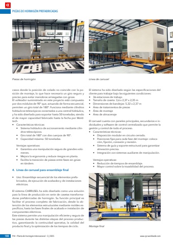 PIEZAS DE HORMIG%u00d3N PREFABRICADAS108 PHI %u2013 Planta de Hormig%u00f3n Internacional %u2013 5 | 2025 www.cpi-worldwide.comcasos donde la posici%u00f3n de colado no coincide con la posici%u00f3n de montaje, lo que hace necesario un giro seguro y preciso para evitar maniobras arriesgadas con gr%u00faas.El volteador suministrado en este proyecto est%u00e1 compuesto por dos m%u00f3dulos de 90%u00b0 que, actuando de forma secuencial, permiten un giro total de 180%u00b0. Funciona mediante cilindros hidr%u00e1ulicos telesc%u00f3picos conectados a una central hidr%u00e1ulica, y ha sido dise%u00f1ado para soportar hasta 50 toneladas, siendo el de mayor capacidad fabricado hasta la fecha por Moldtech.%u2022 Caracter%u00edsticas t%u00e9cnicas:%u2022 Sistema hidr%u00e1ulico de accionamiento mediante cilindros telesc%u00f3picos.%u2022 Giro total de 180%u00b0 con dos cuerpos de 90%u00b0.%u2022 Capacidad m%u00e1xima: 50 toneladas.Ventajas operativas:%u2022 Garantiza una manipulaci%u00f3n segura de grandes vol%u00famenes.%u2022 Mejora la ergonom%u00eda y reduce riesgos en planta.%u2022 Facilita la transici%u00f3n de piezas entre fases sin gr%u00faas en t%u00e1ndem.4. L%u00ednea de carrusel para ensamblaje final%u2022 Uso: Ensamblaje secuencial de los elementos prefabricados, de ejecuci%u00f3n de acabados y de instalaciones el%u00e9ctricas.El sistema CARRUSEL ha sido dise%u00f1ado como una soluci%u00f3n para la l%u00ednea de producci%u00f3n en serie de casetas transformadoras prefabricadas de hormig%u00f3n. Su funci%u00f3n principal es facilitar el proceso completo de fabricaci%u00f3n, desde la obtenci%u00f3n de los elementos estructurales mediante moldes espec%u00edficos, hasta las fases finales de acabado e instalaci%u00f3n de componentes el%u00e9ctricos.Este sistema permite una manipulaci%u00f3n eficiente y segura de las piezas durante las distintas etapas del proceso productivo, garantizando la continuidad operativa, la calidad del producto final y la optimizaci%u00f3n de los tiempos de ciclo.El sistema ha sido dise%u00f1ado seg%u00fan las especificaciones del cliente para trabajar bajo las siguientes condiciones:%u2022 36 estaciones de trabajo%u2022 Tama%u00f1o de caseta: 3,6 x 2,37 x 2,35 m%u2022 Dimensiones de bandejas: 5,32 x 2,37 m%u2022 %u00c1rea de tratamientos de piezas%u2022 %u00c1rea de montaje%u2022 %u00c1rea de almacenajeEl carrusel cuenta con paneles principales, secundarios e individuales y software de control centralizado que permite la gesti%u00f3n y control de todo el proceso.%u2022 Caracter%u00edsticas t%u00e9cnicas:%u2022 Disposici%u00f3n modular en circuito cerrado.%u2022 Posiciones fijas para cada fase del montaje: colocaci%u00f3n, fijaci%u00f3n, conexi%u00f3n y revisi%u00f3n.%u2022 Sistema de gu%u00eda y soporte estructural para garantizar alineaci%u00f3n precisa.%u2022 Integraci%u00f3n con sistemas auxiliares de manipulaci%u00f3n.Ventajas operativas:%u2022 Reducci%u00f3n de tiempos de ensamblaje.%u2022 Mayor control sobre la trazabilidad del proceso.Piezas de hormig%u00f3n L%u00ednea de carruselMontaje final