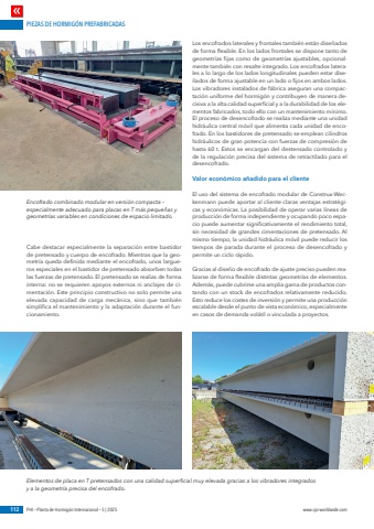 PIEZAS DE HORMIG%u00d3N PREFABRICADAS112 PHI %u2013 Planta de Hormig%u00f3n Internacional %u2013 5 | 2025 www.cpi-worldwide.comCabe destacar especialmente la separaci%u00f3n entre bastidor de pretensado y cuerpo de encofrado. Mientras que la geometr%u00eda queda definida mediante el encofrado, unos largueros especiales en el bastidor de pretensado absorben todas las fuerzas de pretensado. El pretensado se realiza de forma interna: no se requieren apoyos externos ni anclajes de cimentaci%u00f3n. Este principio constructivo no solo permite una elevada capacidad de carga mec%u00e1nica, sino que tambi%u00e9n simplifica el mantenimiento y la adaptaci%u00f3n durante el funcionamiento.Los encofrados laterales y frontales tambi%u00e9n est%u00e1n dise%u00f1ados de forma flexible. En los lados frontales se dispone tanto de geometr%u00edas fijas como de geometr%u00edas ajustables, opcionalmente tambi%u00e9n con resalte integrado. Los encofrados laterales a lo largo de los lados longitudinales pueden estar dise%u00f1ados de forma ajustable en un lado o fijos en ambos lados.Los vibradores instalados de f%u00e1brica aseguran una compactaci%u00f3n uniforme del hormig%u00f3n y contribuyen de manera decisiva a la alta calidad superficial y a la durabilidad de los elementos fabricados, todo ello con un mantenimiento m%u00ednimo.El proceso de desencofrado se realiza mediante una unidad hidr%u00e1ulica central m%u00f3vil que alimenta cada unidad de encofrado. En los bastidores de pretensado se emplean cilindros hidr%u00e1ulicos de gran potencia con fuerzas de compresi%u00f3n de hasta 60 t. Estos se encargan del destensado controlado y de la regulaci%u00f3n precisa del sistema de retractilado para el desencofrado.Valor econ%u00f3mico a%u00f1adido para el clienteEl uso del sistema de encofrado modular de Construx-Weckenmann puede aportar al cliente claras ventajas estrat%u00e9gicas y econ%u00f3micas. La posibilidad de operar varias l%u00edneas de producci%u00f3n de forma independiente y ocupando poco espacio puede aumentar significativamente el rendimiento total, sin necesidad de grandes cimentaciones de pretensado. Al mismo tiempo, la unidad hidr%u00e1ulica m%u00f3vil puede reducir los tiempos de parada durante el proceso de desencofrado y permite un ciclo r%u00e1pido.Gracias al dise%u00f1o de encofrado de ajuste preciso pueden realizarse de forma flexible distintas geometr%u00edas de elementos. Adem%u00e1s, puede cubrirse una amplia gama de productos contando con un stock de encofrados relativamente reducido. Esto reduce los costes de inversi%u00f3n y permite una producci%u00f3n escalable desde el punto de vista econ%u00f3mico, especialmente en casos de demanda vol%u00e1til o vinculada a proyectos.Encofrado combinado modular en versi%u00f3n compacta %u2013 especialmente adecuado para placas en T m%u00e1s peque%u00f1as y geometr%u00edas variables en condiciones de espacio limitado.Elementos de placa en T pretensados con una calidad superficial muy elevada gracias a los vibradores integrados y a la geometr%u00eda precisa del encofrado.