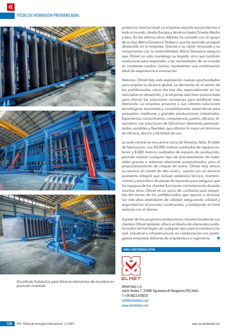 PIEZAS DE HORMIG%u00d3N PREFABRICADAS120 PHI %u2013 Planta de Hormig%u00f3n Internacional %u2013 5 | 2025 www.cpi-worldwide.compresencia internacional. La empresa exporta sus productos a todo el mundo, desde Europa y Am%u00e9rica hasta Oriente Medio y Asia. En los %u00faltimos a%u00f1os, Alberto ha contado con el apoyo de su hija, Maria Giovanna Tedesco, que ha asumido un papel destacado en la empresa. Gracias a su visi%u00f3n renovada y su compromiso con la sostenibilidad, Maria Giovanna asegura que Olmet no solo mantenga su legado, sino que tambi%u00e9n evolucione para responder a las necesidades de un mundo en constante cambio. Juntos, representan una combinaci%u00f3n ideal de experiencia e innovaci%u00f3n.Adem%u00e1s, Olmet Italy est%u00e1 explorando nuevas oportunidades para ampliar su alcance global. La demanda en el sector de los prefabricados crece d%u00eda tras d%u00eda, especialmente en los mercados en desarrollo, y la empresa est%u00e1 bien posicionada para ofrecer las soluciones necesarias para satisfacer esta demanda. La empresa propone a sus clientes soluciones tecnol%u00f3gicas avanzadas y completamente autom%u00e1ticas para peque%u00f1as, medianas y grandes producciones industriales. Experiencia, conocimiento, competencia, pasi%u00f3n, eficacia, dinamismo. Las soluciones de Olmet son altamente personalizadas, vers%u00e1tiles y flexibles, que ofrecen lo mejor en t%u00e9rminos de eficacia, ahorro y facilidad de uso.La sede central se encuentra cerca de Venecia, Italia. El taller de fabricaci%u00f3n, con 43.000 metros cuadrados de espacio exterior y 8.000 metros cuadrados de espacio de producci%u00f3n, permite realizar cualquier tipo de procesamiento de materiales gracias a sistemas altamente automatizados para el preprocesamiento de chapas de acero. Olmet Italy ofrece un servicio al cliente de alto nivel y cuenta con un servicio postventa integral que incluye asistencia t%u00e9cnica, mantenimiento y suministro de piezas de repuesto para asegurar que los equipos de los clientes funcionen correctamente durante muchos a%u00f1os. Olmet es un socio de confianza para empresas del sector de los prefabricados que aspiran a alcanzar los m%u00e1s altos est%u00e1ndares de calidad, asegurando calidad y seguridad en el proceso constructivo, y trabajando en total sinton%u00eda con el cliente.A partir de los proyectos constructivos convencionales de sus clientes, Olmet tambi%u00e9n ofrece el dise%u00f1o de elementos prefabricados de hormig%u00f3n de cualquier tipo para la construcci%u00f3n civil, industrial e infraestructural, en colaboraci%u00f3n con prestigiosas empresas italianas de arquitectura e ingenier%u00eda. nM%u00c1S INFORMACI%u00d3NOlmet Italy s.r.l.vicolo Treviso, 1, 31040 Signoressa di Trevignano (TV), ItaliaT +39 0423 670225info@olmetitaly.comwww.olmetitaly.comEncofrado hidr%u00e1ulico para fabricar elementos de escalera en posici%u00f3n invertida