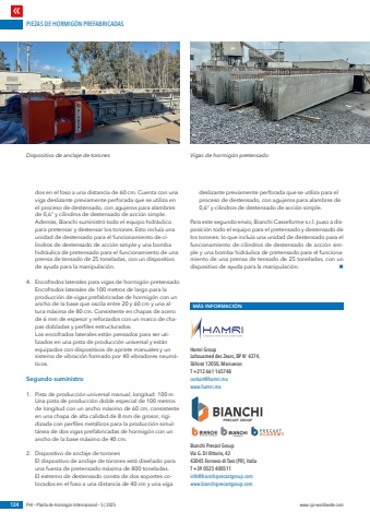 PIEZAS DE HORMIG%u00d3N PREFABRICADAS124 PHI %u2013 Planta de Hormig%u00f3n Internacional %u2013 5 | 2025 www.cpi-worldwide.comdos en el foso a una distancia de 60 cm. Cuenta con una viga deslizante previamente perforada que se utiliza en el proceso de destensado, con agujeros para alambres de 0,6\Adem%u00e1s, Bianchi suministr%u00f3 todo el equipo hidr%u00e1ulico para pretensar y destensar los torones. Esto inclu%u00eda una unidad de destensado para el funcionamiento de cilindros de destensado de acci%u00f3n simple y una bomba hidr%u00e1ulica de pretensado para el funcionamiento de una prensa de tensado de 25 toneladas, con un dispositivo de ayuda para la manipulaci%u00f3n.4. Encofrados laterales para vigas de hormig%u00f3n pretensadoEncofrados laterales de 100 metros de largo para la producci%u00f3n de vigas prefabricadas de hormig%u00f3n con un ancho de la base que oscila entre 20 y 60 cm y una altura m%u00e1xima de 80 cm. Consistente en chapas de acero de 6 mm de espesor y reforzados con un marco de chapas dobladas y perfiles estructurados.Los encofrados laterales est%u00e1n pensados para ser utilizados en una pista de producci%u00f3n universal y est%u00e1n equipados con dispositivos de apriete manuales y un sistema de vibraci%u00f3n formado por 40 vibradores neum%u00e1ticos.Segundo suministro1. Pista de producci%u00f3n universal manual, longitud: 100 mUna pista de producci%u00f3n doble especial de 100 metros de longitud con un ancho m%u00e1ximo de 60 cm, consistente en una chapa de alta calidad de 8 mm de grosor, rigidizada con perfiles met%u00e1licos para la producci%u00f3n simult%u00e1nea de dos vigas prefabricadas de hormig%u00f3n con un ancho de la base m%u00e1ximo de 40 cm.2. Dispositivo de anclaje de toronesEl dispositivo de anclaje de torones est%u00e1 dise%u00f1ado para una fuerza de pretensado m%u00e1xima de 800 toneladas. El extremo de destensado consta de dos soportes colocados en el foso a una distancia de 40 cm y una viga deslizante previamente perforada que se utiliza para el proceso de destensado, con agujeros para alambres de 0,6\Para este segundo env%u00edo, Bianchi Casseforme s.r.l. puso a disposici%u00f3n todo el equipo para el pretensado y destensado de los torones: lo que inclu%u00eda una unidad de destensado para el funcionamiento de cilindros de destensado de acci%u00f3n simple y una bomba hidr%u00e1ulica de pretensado para el funcionamiento de una prensa de tensado de 25 toneladas, con un dispositivo de ayuda para la manipulaci%u00f3n. nM%u00c1S INFORMACI%u00d3NHamri GroupLahouamed des Zears, BP N' 4374,Skhirat 12050, MarruecosT +212 661 165748contact@hamri.mawww.hamri.maBianchi Precast GroupVia G. Di Vittorio, 4243045 Fornovo di Taro (PR), ItaliaT +39 0525 400511info@bianchiprecastgroup.comwww.bianchiprecastgroup.comDispositivo de anclaje de torones Vigas de hormig%u00f3n pretensado