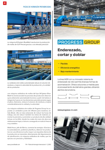 PIEZAS DE HORMIG%u00d3N PREFABRICADASwww.cpi-worldwide.com PHI %u2013 Planta de Hormig%u00f3n Internacional %u2013 5 | 2025una m%u00e1quina soldadora de mallas del tipo M-System BlueMesh ha revolucionado los procesos de producci%u00f3n. Esta m%u00e1quina altamente automatizada funciona a partir de bobina e integra los huecos en los elementos autom%u00e1ticamente seg%u00fan el plano. Asimismo, reduce el volumen de residuos y mejora considerablemente la calidad y la velocidad.%u00abLa m%u00e1quina soldadora de mallas de Progress Group ha supuesto un verdadero punto de inflexi%u00f3n para nosotros%u00bb, se%u00f1ala Blonk. %u00abNo se trata solamente de reducir las horas de trabajo, sino de reducir tambi%u00e9n los restos de material, aumentar la precisi%u00f3n y suministrar un producto de alta calidad. Incluso en los EAU, donde los costes de mano de obra son relativamente bajos, el ahorro conseguido en toda la l%u00ednea es muy notable%u00bb.Walid Aoun, jefe de f%u00e1brica, comenta las ventajas: %u00abGracias a la automatizaci%u00f3n, podemos planificar y fabricar los productos con una eficiencia mucho mayor. Los requisitos diarios de la producci%u00f3n se transmiten directamente del departamento de planificaci%u00f3n a la m%u00e1quina soldadora de mallas, que los ejecuta con precisi%u00f3n y fiabilidad%u00bb.La m%u00e1quina M-System BlueMesh revoluciona la producci%u00f3n de mallas de Gulf Precast gracias a una elevada precisi%u00f3nLa soldadura de mallas automatizada reduce el volumen de residuos y mejora la velocidad de la producci%u00f3n y la calidad de los productos Enderezado, cortar y doblar%u02db Flexible%u02db Eficiencia energ%u00e9tica%u02db Bajo mantenimientowww.progress-m.comLa l%u00ednea MSR con su innovador sistema de enderezado de rotor permite diversas formas de automatizaci%u00f3n. Ofrece soluciones a medida para el procesamiento de di%u00e1metros grandes utilizando alambre de la bobina.