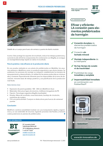 PIEZAS DE HORMIG%u00d3N PREFABRICADASwww.cpi-worldwide.com PHI %u2013 Planta de Hormig%u00f3n Internacional %u2013 5 | 2025tructivo. Esto protege los soportes de encofrado, reduce los trabajos posteriores y aumenta la vida %u00fatil de los componentes. En combinaci%u00f3n con MagFly, se consigue un montaje/desmontaje r%u00e1pido sin da%u00f1ar el encofrado.Para la pr%u00e1ctica: m%u00e1s eficacia en la producci%u00f3n diariaEn una prueba realizada en una planta de prefabricados en Westfalia, los usuarios valoraron a MultiForm como un producto ergon%u00f3mico que ahorra tiempo. Se aceleraron los procesos de montaje, se redujeron notablemente los tiempos de reequipamiento y desencofrado y la calidad de las piezas producidas se mantuvo alta y constante. Especialmente relevante para los responsables de la toma de decisiones: menores tasas de trabajo posterior y una planificaci%u00f3n de la producci%u00f3n m%u00e1s fluida.Datos t%u00e9cnicos clave%u2022 Espesores de pared ajustables: 100 - 350 mm (MultiForm Duo)%u2022 Materiales: Estructura ligera de aluminio, chaflanes triangulares de PE%u2022 Fijaci%u00f3n: Tecnolog%u00eda magn%u00e9tica MagFly (reutilizable)%u2022 Empleo: Mesa de encofrado, mesa basculante, bandeja de circulaci%u00f3n, superficies de madera%u2022 Con una particularidad: Cuerpos no destructivos para huecos de ventanas/puertasConclusi%u00f3n MultiForm combina versatilidad modular con una manipulaci%u00f3n r%u00e1pida y ergon%u00f3mica y un uso sostenible de recursos, logrando procesos m%u00e1s fluidos y menores costes posteriores en plantas de prefabricados. nM%u00c1S INFORMACI%u00d3NB.T. innovation GmbH Sudenburger Wuhne 60 39116 Magdeburg, Alemania T +49 391 73520 info@bt-innovation.dewww.bt-innovation.deDetalle de un cuerpo para hueco de ventana o puerta de dise%u00f1o modularEficaz y eficiente: LA conexi%u00f3n para elementos prefabricados de hormig%u00f3nB.T. INNOVATION GMBHwww.bt-innovation.deConexi%u00f3n duradera de elementos prefabricados de hormig%u00f3nConexi%u00f3n sin lechada mineralMontaje independiente de la intemperie No hay tiempo de curado ni de inactividadPosibilidad de carga inmediata y completaImpermeabilidad inmediataen combinaci%u00f3n con RubberElast%u00aeRubberElast%u00aeBT-Spannschloss%u00aePara una construcci%u00f3n m%u00e1s r%u00e1pida