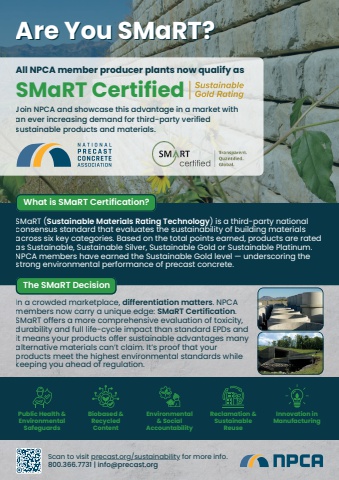 The SMaRT DecisionJoin NPCA and showcase this advantage in a market withan ever increasing demand for third-party verifiedsustainable products and materials.All NPCA member producer plants now qualify asSMaRT Certified SustainableGold RatingWhat is SMaRT Certification?Reclamation &SustainableReusePublic Health &EnvironmentalSafeguardsBiobased &RecycledContentEnvironmental& SocialAccountabilityInnovation inManufacturingSMaRT (Sustainable Materials Rating Technology) is a third-party nationalconsensus standard that evaluates the sustainability of building materialsacross six key categories. Based on the total points earned, products are ratedas Sustainable, Sustainable Silver, Sustainable Gold or Sustainable Platinum.NPCA members have earned the Sustainable Gold level %u2014 underscoring thestrong environmental performance of precast concrete.Scan to visit precast.org/sustainability for more info.800.366.7731 | info@precast.orgIn a crowded marketplace, differentiation matters. NPCAmembers now carry a unique edge: SMaRT Certification.SMaRT offers a more comprehensive evaluation of toxicity,durability and full life-cycle impact than standard EPDs andit means your products offer sustainable advantages manyalternative materials can%u2019t claim. It%u2019s proof that yourproducts meet the highest environmental standards whilekeeping you ahead of regulation.Are You SMaRT? Are You SMaRT?