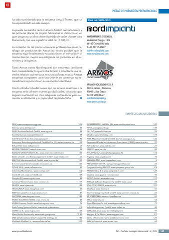 PIEZAS DE HORMIG%u00d3N PREFABRICADASwww.cpi-worldwide.com PHI %u2013 Planta de Hormig%u00f3n Internacional %u2013 5 | 2025 145ha sido suministrado por la empresa belga i-Theses, que se ha especializado en este campo.La puesta en marcha de la m%u00e1quina finaliz%u00f3 correctamente y las primeras placas de forjado fabricadas se utilizaron en un gran proyecto: un almac%u00e9n refrigerado de varias plantas para Dianomefs, con una superficie total de 10 000 m%u00b2.La inclusi%u00f3n de las placas alveolares pretensadas en el cat%u00e1logo de productos de Armos ha hecho posible que la empresa siga fortaleciendo su posici%u00f3n en el mercado y, al mismo tiempo, mejore sus m%u00e1rgenes de ganancias en el suministro y la log%u00edstica.Tanto Armos como Nordimpianti son empresas familiares bien consolidadas, lo que las ha llevado a establecer una estrecha relaci%u00f3n que se basa en una confianza mutua. Ambas empresas comparten un mismo inter%u00e9s en conservar su extraordinaria reputaci%u00f3n en sus respectivos sectores.Con la introducci%u00f3n del nuevo tipo de forjado en Armos, a la empresa se le ofrecen nuevas posibilidades, de modo que seguir%u00e1 invirtiendo en m%u00e1s m%u00e1quinas autom%u00e1ticas para aumentar su eficiencia y su capacidad de producci%u00f3n. nM%u00c1S INFORMACI%u00d3NNORDIMPIANTI SYSTEM SRLVia Erasmo Piaggio, 19/A66100 Chieti (CH), ItaliaT +39 0871 540222info@nordimpianti.comwww.nordimpianti.comARMOS PROKATASKEVES S.A4th km Larisas %u2013 Sikouriou41002 Larisa, GreciaT 2410 575035-6-7info@armosprokat.grwww.armosprokat.grAEM, www.conexpoconagg.com 103Afinitas, www.afinitas.com 23AGRU Kunststofftechnik GmbH, www.agru.at 99Aircrete Europe, www.aircrete.com 39ASSYX GmbH & Co. KG, www.assyx.com 95Avermann Betonfertigteiltechnik GmbH & Co. KG, www.avermann.de 115Bekaert NV, www.bekaert.com 61BESSER COMPANY, www.besser.com 33BIANCHI CASSEFORME S.R.L., www.bianchicasseforme.it 125Bibko Umwelt- und Reinigungstechnik GmbH, www.bibko.com 51BRECON Vibrationstechnik GmbH, www.brecon.de 121B.T. innovation GmbH, www.bt-innovation.de 131COLLE S.P.A., www.collespa.com 31Columbia Machine Inc., www.colmac.com C2Combilift Ltd., www.combilift.com 129Conplex BV, www.conplex.com 89Construx Weckenmann, www.construx.eu 111EBAWE, www.ebawe.de 135HESS GROUP, www.hessgroup.com 37IMER Group (O.R.U. S.p.A.), www.oru.it 47KAPPEMA, www.kappema.com 141KNIELE BAUMASCHINEN, www.kniele.de 41KOBRA Formen GmbH, www.kobragroup.com 73Kraft Curing Systems GmbH, www.kraft-systems.com C3MAPEI S.p.A., www.mapei.com 137Masa GmbH Andernach, www.masa-group.com 79, 87MBK Maschinenbau GmbH, www.mbk-kisslegg.de 143Moldtech Moldes S.L., www.moldtechsl.es 107NORDIMPIANTI SYSTEM SRL, www.nordimpianti.com 141NPCA, www.precast.org 139OLI SpA, www.olivibra.com 55OLMET, www.olmetitaly.com 119PAUL Maschinenfabrik GmbH & Co. KG, www.paul.eu 133Pavers and Blocks Manufacturers Association (PBMA), www.pbma.in 97Peikko Group, www.peikko.com 21PERI SE, www.peri.de 83PHILIPP GmbH, www.philipp-gruppe.de 113Poyatos, www.poyatos.com 75PRENSOLAND, www.prensoland.com 5PRINZING PFEIFFER, www.prinzing-pfeiffer.com 27Progress Holding AG/SPA, www.progress-group.info C4PROGRESS M & A, www.progress-m.com 127Quadra, www.quadra-concrete.com 93RATEC GmbH, www.ratec.org 117RIB SAA Software Engineering GmbH, www.saa.at 59SCHL%u00dcSSELBAUER, www.sbm.at 101SICOMA, www.sicoma.it 57Sommer Anlagentechnik GmbH, www.sommer-precast.de 65SR SCHINDLER, www.sr-schindler.com 81TEKA, www.teka.de 53Tiger Machine Co. Ltd., www.tigermachine.com 77Vollert Anlagenbau GmbH, www.vollert.de 43WASA AG, www.wasa-technologies.com 91Wiggert & Co. GmbH, www.wiggert.com C1World of Concrete, www.worldofconcrete.com 123XYPEX Chemical, www.xypex.com 63EMPRESAS ANUNCIADORAS