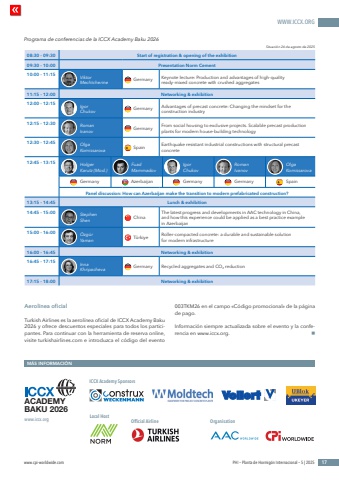 WWW.ICCX.ORGwww.cpi-worldwide.com PHI %u2013 Planta de Hormig%u00f3n Internacional %u2013 5 | 2025 17Aerol%u00ednea oficialTurkish Airlines es la aerol%u00ednea oficial de ICCX Academy Baku 2026 y ofrece descuentos especiales para todos los participantes. Para continuar con la herramienta de reserva online, visite turkishairlines.com e introduzca el c%u00f3digo del evento 003TKM26 en el campo %u00abC%u00f3digo promocional%u00bb de la p%u00e1gina de pago.Informaci%u00f3n siempre actualizada sobre el evento y la conferencia en www.iccx.org. nM%u00c1S INFORMACI%u00d3Nwww.iccx.org Local HostICCX Academy SponsorsACADEMYBAKU 2026OrganisationPrograma de conferencias de la ICCX Academy Baku 2026Official AirlineSituaci%u00f3n 26 de agosto de 202508:30 - 09:30 Start of registration & opening of the exhibition09:30 - 10:00 Presentation Norm Cement10:00 - 11:15 ViktorMechtcherine Germany Keynote lecture: Production and advantages of high-quality ready-mixed concrete with crushed aggregates11:15 - 12:00 Networking & exhibition12:00 - 12:15 IgorChukov Germany Advantages of precast concrete: Changing the mindset for the construction industry12:15 - 12:30 RomanIvanov Germany From social housing to exclusive projects. Scalable precast production plants for modern house-building technology12:30 - 12:45 OlgaKomissarova Spain Earthquake resistant industrial constructions with structural precast concrete12:45 - 13:15Panel discussion: How can Azerbaijan make the transition to modern prefabricated construction?13:15 - 14:45 Lunch & exhibition14:45 - 15:00 StephenShen ChinaThe latest progress and developments in AAC technology in China, and how this experience could be applied as a best practice example in Azerbaijan15:00 - 16:00 %u00d6zg%u00fcrYaman T%u00fcrkiye Roller-compacted concrete: a durable and sustainable solution for modern infrastructure16:00 - 16:45 Networking & exhibition16:45 - 17:15 InnaKhripacheva Germany Recycled aggregates and CO2 reduction17:15 - 18:00 Networking & exhibitionHolgerKarutz (Mod.)FuadMammadovOlgaKomissarovaIgorChukovRomanIvanovGermany Azerbaijan Germany Germany Spain