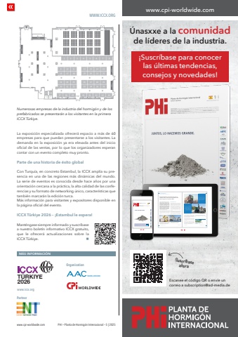 WWW.ICCX.ORGwww.cpi-worldwide.com PHI %u2013 Planta de Hormig%u00f3n Internacional %u2013 5 | 2025M%u00c1S INFORMACI%u00d3Nwww.iccx.orgT%u00dcRKIYE2026PartnerOrganisationLa exposici%u00f3n especializada ofrecer%u00e1 espacio a m%u00e1s de 60 empresas para que puedan presentarse a los visitantes. La demanda en la exposici%u00f3n ya era elevada antes del inicio oficial de las ventas, por lo que los organizadores esperan contar con un evento completo muy pronto.Parte de una historia de %u00e9xito globalCon Turqu%u00eda, en concreto Estambul, la ICCX ampl%u00eda su presencia en una de las regiones m%u00e1s din%u00e1micas del mundo. La serie de eventos es conocida desde hace a%u00f1os por una orientaci%u00f3n cercana a la pr%u00e1ctica, la alta calidad de las conferencias y su formato de networking %u00fanico, caracter%u00edsticas que tambi%u00e9n marcar%u00e1n la edici%u00f3n turca.M%u00e1s informaci%u00f3n para visitantes y expositores disponible en la p%u00e1gina oficial del evento.ICCX T%u00fcrkiye 2026 %u2013 %u00a1Estambul le espera!Mant%u00e9ngase siempre informado y suscr%u00edbase a nuestro bolet%u00edn informativo ICCX gratuito, que le ofrecer%u00e1 actualizaciones sobre la ICCX T%u00fcrkiye. nNumerosas empresas de la industria del hormig%u00f3n y de los prefabricados se presentar%u00e1n a los visitantes en la primera ICCX T%u00fcrkiye.www.cpi-worldwide.comPIEZAS DE HORMIG%u00d3N PREFABRICADAS PIEZAS DE HORMIG%u00d3N PREFABRICADAS102 PHI %u2013 Planta de Hormig%u00f3n Internacional %u2013 1 | 2025 www.cpi-worldwide.com www.cpi-worldwide.com PHI %u2013 Planta de Hormig%u00f3n Internacional %u2013 1 | 2025 103Desde 1998, Combilift ha cambiado el sector de la manipulaci%u00f3n de materiales con la aportaci%u00f3n de soluciones a medida que ahorran espacio. La empresa irlandesa ha exportado m%u00e1s de 90 000 carretillas elevadoras a 85 pa%u00edses y es conocida por sus soluciones innovadoras. La amplia gama de productos abarca carretillas universales, laterales y de brazo articulado, carretillas compactas, carros de elevaci%u00f3n tipo p%u00f3rtico y gr%u00faas p%u00f3rtico m%u00f3viles con una capacidad de carga que oscila entre 1 y m%u00e1s de 150 toneladas.Debido a sus formas, tama%u00f1os y pesos diferentes (desde baldosas de hormig%u00f3n hasta grandes tubos), los productos de hormig%u00f3n son dif%u00edciles de manipular. Los aparatos de Combilift han sido desarrollados para solucionar las dificultades asociadas a la elevaci%u00f3n y el movimiento de elementos especialmente pesados y sobredimensionados en naves de almacenamiento y zonas exteriores.La gama de aparatos de elevaci%u00f3n pesados de Combilift incluye, entre otras cosas, el Combi-SC (carro de elevaci%u00f3n tipo p%u00f3rtico) y el Combi-MG (gr%u00faa p%u00f3rtico m%u00f3vil). Este tipo de equipo es la soluci%u00f3n ideal para manipular y transportar elementos de gran tama%u00f1o, t%u00edpicos en la industria de los prefabricados de hormig%u00f3n, como vigas, losas prefabricadas y placas.Cargas sobredimensionadasActualmente, todos los profesionales involucrados en el sector de la construcci%u00f3n otorgan la m%u00e1xima prioridad a la sostenibilidad. Una ventaja esencial de las series de productos SC y MG es su reducido peso, de modo que funcionan con una elevada eficiencia energ%u00e9tica. Asimismo, los grandes neum%u00e1ticos Flotation, resistentes a las aver%u00edas, reducen considerablemente la presi%u00f3n sobre el suelo, de modo que se pueden utilizar sobre todo tipo de pavimentos, incluso con un terreno irregular y medio rugoso. De este modo, a su vez, se evita la necesidad de renovar el pavimento. La posibilidad de optimizar la capacidad de almacenamiento y evitar costosas renovaciones del pavimento, tambi%u00e9n reduce el espacio necesario, as%u00ed como la huella ecol%u00f3gica de un emplazamiento, lo que evita la expansi%u00f3n a solares nuevos, con los costes que ello implica.Otras ventajas dignas de menci%u00f3n son una maniobrabilidad extraordinariamente buena en un espacio reducido y la seguridad mejorada que, en los modelos con cabina del conductor, ofrece una visi%u00f3n panor%u00e1mica. Asimismo, las opciones de control remoto contribuyen a mejorar la seguridad y la productividad, y solo requieren un operario para la conducci%u00f3n.Pesado dispositivo de elevaci%u00f3n para la industria de los elementos prefabricados de hormig%u00f3n en la bauma 2025Combilift, Annahagh, Monaghan, Co. Monaghan, H18 VP65, IrlandaCarretillas electr%u00f3nicas universalesLa serie C de carretillas universales ha sido desarrollada para mejorar el proceso de trabajo, donde se a%u00fanan tres carretillas en una sola: un cargador lateral, una carretilla contrapesada y una carretilla para pasillos estrechos. Las carretillas universales de Combilift son perfectas para la industria de los elementos prefabricados de hormig%u00f3n.El equipo ha sido desarrollado para manipular productos prefabricados de hormig%u00f3n de gran longitud y para circular por pasillos estrechos, de modo que se optimiza el almacenamiento, se mejora la eficiencia y aumenta la seguridad de funcionamiento.Haci%u00e9ndose eco de la creciente demanda de aparatos con accionamiento el%u00e9ctrico, Combilift sigue ampliando su oferta de carretillas el%u00e9ctricas. La carretilla universal Combi-CB70E es la incorporaci%u00f3n m%u00e1s reciente de la serie. Con una capacidad de carga de 7 toneladas, se trata de la carretilla contrapesada de su estilo m%u00e1s compacta del mercado.Las personas que visiten el stand FS.1003/4 de Combilift en la feria bauma tendr%u00e1n la ocasi%u00f3n de informarse de primera mano de las posibilidades que ofrecen algunos de estos modelos. nCombi-SC (carro de elevaci%u00f3n tipo p%u00f3rtico): la extraordinaria maniobrabilidad de 3 ruedas del Combi-SC es sin%u00f3nimo de m%u00e1xima estabilidad de carga. El funcionamiento opcional con control remoto mejora la seguridad y la productividad, y solamente exige un operario para la conducci%u