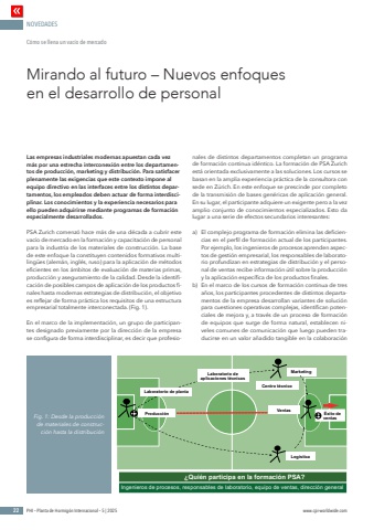 NOVEDADES22 PHI %u2013 Planta de Hormig%u00f3n Internacional %u2013 5 | 2025 www.cpi-worldwide.comLas empresas industriales modernas apuestan cada vez m%u00e1s por una estrecha interconexi%u00f3n entre los departamentos de producci%u00f3n, marketing y distribuci%u00f3n. Para satisfacer plenamente las exigencias que este contexto impone al equipo directivo en las interfaces entre los distintos departamentos, los empleados deben actuar de forma interdisciplinar. Los conocimientos y la experiencia necesarios para ello pueden adquirirse mediante programas de formaci%u00f3n especialmente desarrollados.PSA Zurich comenz%u00f3 hace m%u00e1s de una d%u00e9cada a cubrir este vac%u00edo de mercado en la formaci%u00f3n y capacitaci%u00f3n de personal para la industria de los materiales de construcci%u00f3n. La base de este enfoque la constituyen contenidos formativos multiling%u00fces (alem%u00e1n, ingl%u00e9s, ruso) para la aplicaci%u00f3n de m%u00e9todos eficientes en los %u00e1mbitos de evaluaci%u00f3n de materias primas, producci%u00f3n y aseguramiento de la calidad. Desde la identificaci%u00f3n de posibles campos de aplicaci%u00f3n de los productos finales hasta modernas estrategias de distribuci%u00f3n, el objetivo es reflejar de forma pr%u00e1ctica los requisitos de una estructura empresarial totalmente interconectada. (Fig. 1). En el marco de la implementaci%u00f3n, un grupo de participantes designado previamente por la direcci%u00f3n de la empresa se configura de forma interdisciplinar, es decir que profesionales de distintos departamentos completan un programa de formaci%u00f3n continua id%u00e9ntico. La formaci%u00f3n de PSA Zurich est%u00e1 orientada exclusivamente a las soluciones. Los cursos se basan en la amplia experiencia pr%u00e1ctica de la consultora con sede en Z%u00farich. En este enfoque se prescinde por completo de la transmisi%u00f3n de bases gen%u00e9ricas de aplicaci%u00f3n general. En su lugar, el participante adquiere un exigente pero a la vez amplio conjunto de conocimientos especializados. Esto da lugar a una serie de efectos secundarios interesantes:a) El complejo programa de formaci%u00f3n elimina las deficiencias en el perfil de formaci%u00f3n actual de los participantes. Por ejemplo, los ingenieros de procesos aprenden aspectos de gesti%u00f3n empresarial, los responsables de laboratorio profundizan en estrategias de distribuci%u00f3n y el personal de ventas recibe informaci%u00f3n %u00fatil sobre la producci%u00f3n y la aplicaci%u00f3n espec%u00edfica de los productos finales.b) En el marco de los cursos de formaci%u00f3n continua de tres a%u00f1os, los participantes procedentes de distintos departamentos de la empresa desarrollan variantes de soluci%u00f3n para cuestiones operativas complejas, identifican potenciales de mejora y, a trav%u00e9s de un proceso de formaci%u00f3n de equipos que surge de forma natural, establecen niveles comunes de comunicaci%u00f3n que luego pueden traducirse en un valor a%u00f1adido tangible en la colaboraci%u00f3n Mirando al futuro %u2013 Nuevos enfoques en el desarrollo de personalC%u00f3mo se llena un vac%u00edo de mercadofifffflffifl%u001a%u001a%u0019%u0018%u0017%u0016%u0015ff%u0014%u0013%u0012%u0019%u0017%u0011%u0010%u0013%u0017%u0012%u0015%u000f %u000e%u0019%u0012ffl%u000cffi%u0013%u000c%u000b%u0013%u0017%u0012%u0015%u000f%u000c%u000c%u000c%u0015%u0009fflff%u0015%u0012fflff%u0019ffl%u000cffi%u0013%u000c%u0008%u0007%u0015%u0017%u0012%u0015%u0006%u0013%u0017%u0012ffffl%u000c%u0012%u0005%u001a%u0017%u0019%u001affl%u000c%u0015%u0009fflff%u0015%u0012fflff%u0019ffl%u000cffi%u0013%u000c%u0015%u0008%u0007%u0019%u001a%u0015%u001a%u0019ffl%u0017%u0013%u000f%u000c%u0012%u0005%u001a%u0017%u0019%u001a%u0015%u000fffl%u0011%u0004%u000f%u0012%u0019%u001a%u0015%u0003%u0001fiff fflffifl%u001afi%u0019fifflffi%u000c%u0081ff%u000c%u008dffi%u000c%u008f%u0018fl%u0017ffi%u0019fi%u0016ff%u000c%u0090%u009d%u00a0%u00adfifffflffiffflffi%u001a%u0019%u0018 %u0017ffi%u0016%u0015%u001a%u0019%u0014ffi%u0018%u0019%u0018%u0013%u0016%u001affi%u0018%u0015%u0019ff%u0018%u0012%u0011%u0010ffi%u0018%u0016%u0017ffi%u0016%u0010%u0012%u0011%u0019%u001a%u0012%u000f%u0019%u001afl%u0019%u0013%u0016ffi%u000efl%u0015%u0019%u0016%u0017ffi%u0016%u000cffiff%u000f%u0012%u0018%u0013%u0016%u0017fl%u001affi%u0014%u0014fl%u000bff%u0016fflffiffffi%u001a%u0012%u0010Fig. 1: Desde la producci%u00f3n de materiales de construcci%u00f3n hasta la distribuci%u00f3n