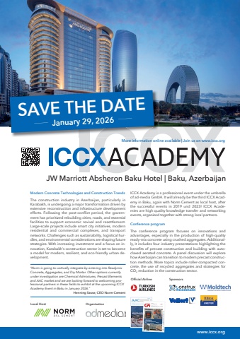 _ January 29, 2026SAVE THE DATE _www.iccx.org JW Marriott Absheron Baku Hotel | Baku, AzerbaijanMore information online available | Join us on www.iccx.orgModern Concrete Technologies and Construction TrendsThe construction industry in Azerbaijan, particularly in Karabakh, is undergoing a major transformation driven by extensive reconstruction and infrastructure development efforts. Following the post-conflict period, the government has prioritized rebuilding cities, roads, and essential facilities to support economic revival and resettlement. Large-scale projects include smart city initiatives, modernresidential and commercial complexes, and transport networks. Challenges such as sustainability, logistical hurdles, and environmental considerations are shaping future strategies. With increasing investment and a focus on innovation, Karabakh%u2019s construction sector is set to become a model for modern, resilient, and eco-friendly urban development.%u201cNorm is going to vertically integrate by entering into Readymix Concrete, Aggregates, and Dry Mortar. Other options currently under investigation are Chemical Admixtures, Precast Elements and AAC market and we are looking forward to welcoming professional partners in these fi elds to exhibit at the upcoming ICCX Academy Event in Baku in January 2026.%u201dHenning Sasse, CEO Norm CementICCX Academy is a professional event under the umbrella of ad-media GmbH. It will already be the third ICCX Academy in Baku, again with Norm Cement as local host, after the successful events in 2019 und 2023! ICCX Academies are high quality knowledge transfer and networking events, organized together with strong local partners.Conference program The conference program focuses on innovations and advantages, especially in the production of high-quality ready-mix concrete using crushed aggregates. Additionally, it includes four industry presentations highlighting the benefi ts of precast construction and building with autoclaved aerated concrete. A panel discussion will explore how Azerbaijan can transition to modern precast construction methods. More topics include roller-compacted concrete, the use of recycled aggregates and strategies for CO2 reduction in the construction sector.Local Host Organisationwww.aac-worldwide.com3 | 2025News & Markets Wehrhahn Teeyer Smart Technology Corp. Ltd. established in China Science & Innovation Integrated RC columns in formwork blocks and new partition wall connection Production Technology Smart Steam Solution for Green and Efficient AAC Production Application & Construction Coupled autoclaved aerated concrete confined walls subjected to lateral loads Projects A winery that blends tradition, innovation, and sustainabilityAerated Concrete AutoclavedWORLDWIDEwww.kapag.kz4 www.cpi-worldwide.com2025Concrete Plant InternationalWorldwide English EditionICCX SPECIAL Save the Date %u2013 ICCX T%u00fcrkiye 2026 | ICCX Academy Baku 2026 TECHNOLOGY Utilizing incineration ashes CONCRETE CONCRETE PRODUCTS CONCRETE PIPES AND MANHOLES Innovation as a growth driver New Radial Press for manufacturing concrete pipes at Viet Cuong Concrete in Vietnam PRECAST CONCRETE ELEMENTS Precast carbon concrete parts from the battery mould MIXED AND COMPACTED Concrete %u2013 Well DoneExpert in block/paver machinesand robotic solutions. www.quadra-concrete.com2504_cpi_U1-4_en.indd 1 01.07.25 13:39Official Airline Sponsors