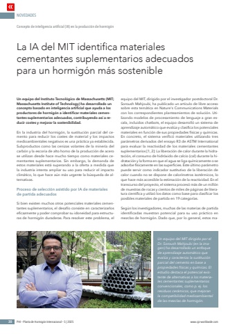 NOVEDADES30 PHI %u2013 Planta de Hormig%u00f3n Internacional %u2013 5 | 2025 www.cpi-worldwide.comUn equipo del Instituto Tecnol%u00f3gico de Massachusetts (MIT; Massachusetts Institute of Technology) ha desarrollado un concepto basado en inteligencia artificial que ayuda a los productores de hormig%u00f3n a identificar materiales cementantes suplementarios adecuados, contribuyendo as%u00ed a reducir costes y mejorar la sostenibilidad.En la industria del hormig%u00f3n, la sustituci%u00f3n parcial del cemento para reducir los costes de material y los impactos medioambientales negativos es una pr%u00e1ctica ya establecida. Subproductos como las cenizas volantes de la miner%u00eda del carb%u00f3n y la escoria de alto horno de la producci%u00f3n de acero se utilizan desde hace mucho tiempo como materiales cementantes suplementarios. Sin embargo, la demanda de estos materiales est%u00e1 superando a la oferta a medida que la industria intenta ampliar su uso para reducir el impacto clim%u00e1tico, lo que hace a%u00fan m%u00e1s urgente la b%u00fasqueda de alternativas.Proceso de selecci%u00f3n asistido por IA de materiales de partida adecuadosSi bien existen muchos otros potenciales materiales cementantes suplementarios, el desaf%u00edo consiste en caracterizarlos eficazmente y poder comprobar su idoneidad para estructuras de hormig%u00f3n duraderas. Para resolver este problema, el equipo del MIT, dirigido por el investigador postdoctoral Dr. Soroush Mahjoubi, ha publicado un art%u00edculo de libre acceso sobre esta tem%u00e1tica en Nature's Communications Materials con los correspondientes planteamientos de soluci%u00f3n. Utilizando modelos de procesamiento de lenguaje a gran escala, incluidos chatbots, el equipo desarroll%u00f3 un sistema de aprendizaje autom%u00e1tico que eval%u00faa y clasifica los potenciales materiales en funci%u00f3n de sus propiedades f%u00edsicas y qu%u00edmicas. En concreto, el sistema verific%u00f3 materiales utilizando tres par%u00e1metros derivados del ensayo R3 de ASTM International para evaluar la reactividad de los materiales cementantes suplementarios [1, 2]: La liberaci%u00f3n de calor durante la hidrataci%u00f3n, el consumo de hidr%u00f3xido de calcio (cal) durante la hidrataci%u00f3n y la forma en que el agua se liga qu%u00edmicamente o se adsorbe f%u00edsicamente en las superficies. Este %u00faltimo par%u00e1metro puede servir como indicador sustitutivo de la liberaci%u00f3n de calor cuando no se dispone de calor%u00edmetros isot%u00e9rmicos, lo que hace m%u00e1s accesible la estimaci%u00f3n de la reactividad. En el transcurso del proyecto, el sistema proces%u00f3 m%u00e1s de un mill%u00f3n de muestras de rocas y cientos de miles de p%u00e1ginas de literatura cient%u00edfica y utiliz%u00f3 los datos como base para clasificar los posibles materiales de partida en 19 categor%u00edas.Seg%u00fan los investigadores, muchas de las materias de partida identificadas muestran potencial para su uso pr%u00e1ctico en mezclas de hormig%u00f3n. Dado que, por lo general, estos maLa IA del MIT identifica materiales cementantes suplementarios adecuados para un hormig%u00f3n m%u00e1s sostenibleConcepto de inteligencia artificial (IA) en la producci%u00f3n de hormig%u00f3nUn equipo del MIT dirigido por el Dr. Soroush Mahjoubi (en la imagen) ha desarrollado un enfoque de aprendizaje autom%u00e1tico que eval%u00faa y caracteriza la sustituci%u00f3n parcial del cemento en base a propiedades f%u00edsicas y qu%u00edmicas. El estudio destaca el potencial existente de alternativas a los materiales cementantes suplementarios convencionales, como p. ej. los residuos cer%u00e1micos, que mejoran la compatibilidad medioambiental de las mezclas de hormig%u00f3n.