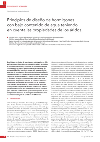 TECNOLOGIA DEL HORMIG%u00d3N38 PHI %u2013 Planta de Hormig%u00f3n Internacional %u2013 5 | 2025 www.cpi-worldwide.comEn el futuro, el dise%u00f1o de hormigones optimizados en CO2y eficientes en el uso de recursos exigir%u00e1 reducir al m%u00e1ximo el contenido de cl%u00ednker y minimizar el contenido de agua, manteniendo al mismo tiempo buenas propiedades de procesabilidad del hormig%u00f3n fresco. A la hora de dise%u00f1ar este tipo de hormigones altamente optimizados, es fundamental considerar la calidad de cada uno de los materiales de partida (como el cemento y los %u00e1ridos) en relaci%u00f3n con la demanda de agua y requisitos de superfluidificantes. En el marco del presente art%u00edculo, se analiza la influencia de distintas propiedades granulom%u00e9tricas de los %u00e1ridos finos sobre la procesabilidad y la demanda de agua del hormig%u00f3n fresco a partir de estudios sistem%u00e1ticos sobre la procesabilidad. Sobre esa base se desarrolla un concepto para estimar el contenido de agua m%u00ednimo posible de una composici%u00f3n espec%u00edfica de hormig%u00f3n, teniendo en cuenta los materiales de partida y aditivos fluidificantes.1 Introducci%u00f3nEn la tecnolog%u00eda moderna del hormig%u00f3n, el perfil de requisitos de las distintas composiciones de hormig%u00f3n ha cambiado significativamente en los %u00faltimos a%u00f1os. A medida que aumenta el n%u00famero de adiciones y aditivos posibles, las composiciones de hormig%u00f3n se vuelven cada vez m%u00e1s complejas. Por razones econ%u00f3micas, en algunos casos se redujeron considerablemente las cantidades de conglomerante utilizadas en los hormigones y, por tanto, los vol%u00famenes correspondientes de pasta. Por razones ecol%u00f3gicas, el dise%u00f1o futuro de hormigones optimizados en CO2 requerir%u00e1 composiciones con una reducci%u00f3n m%u00e1xima de cl%u00ednker. Hasta ahora, el cl%u00ednker de cemento Portland se ha sustituido principalmente por materiales cementantes suplementarios reactivos o inertes [1, 2]. En la pr%u00e1ctica se utilizan desde hace d%u00e9cadas materiales cementantes suplementarios (SCM; Supplementary Cementitious Materials), como escoria de alto horno, cenizas volantes o polvo de piedra caliza, para producir este tipo de hormigones con contenido reducido de cl%u00ednker. Debido a la menor reactividad hasta el comportamiento inerte de tales SCM, especialmente en el caso del polvo de piedra caliza, la reducci%u00f3n del contenido de cl%u00ednker para conseguir las propiedades mec%u00e1nicas relevantes y, especialmente, las relevantes para la durabilidad, suele ir asociada a una reducci%u00f3n del contenido de agua o del valor a/c [3, 4, 5]. Los estudios de Palm et al. [4] muestran, por ejemplo, que la resistencia a la carbonataci%u00f3n de este tipo de hormigones con cementos ternarios (factor de cl%u00ednker aprox. 0,5) con escoria de alto horno y una elevada proporci%u00f3n de polvo de piedra caliza como otros componentes principales, adem%u00e1s del cl%u00ednker, puede aumentarse significativamente mediante una reducci%u00f3n de la relaci%u00f3n agua/cemento de 0,50 a 0,35. Por consiguiente, la tasa de sustituci%u00f3n posible depende tanto del rendimiento requerido del hormig%u00f3n como, en particular, de la posible reducci%u00f3n de agua para una procesabilidad correspondiente del hormig%u00f3n fresco. En este contexto, los aditivos fluidificantes desempe%u00f1an un papel decisivo en el ajuste de la procesabilidad, ya que permiten, entre otras cosas, una reducci%u00f3n del cl%u00ednker con la consiguiente reducci%u00f3n de agua para una resistencia comparable. Sin embargo, es necesario un contenido de pasta suficiente para garantizar la estabilidad del hormig%u00f3n fresco y evitar fen%u00f3menos de segregaci%u00f3n [6]. La procesabilidad del hormig%u00f3n fresco viene determinada tanto por el contenido de pasta como por las propiedades de la pasta. Una reducci%u00f3n del contenido de agua conlleva una reducci%u00f3n del contenido de pasta. En consecuencia, es particularmente importante para los hormigones con bajo contenido de agua que la mayor cantidad posible del agua de amasado est%u00e9 disponible para fluidificar el hormig%u00f3n fresco. Las primeras experiencias pr%u00e1cticas demuestran que es posible reducir el contenido de agua hasta 130 l/m%u00b3 [7]. Para Principios de dise%u00f1o de hormigones con bajo contenido de agua teniendo en cuenta las propiedades de los %u00e1ridosOptimizaci%u00f3n del contenido de pastan Dr. Tobias Schack, Instituto de Materiales de Construcci%u00f3n / Universidad Leibniz de Hannover, AlemaniaDipl.-Ing. Sebastian Dittmar, Master Builders Solutions Deutschland GmbH, AlemaniaBastian Strybny, M.Sc., Instituto de Materiales de Construcci%u00f3n / Leibniz Universit%u00e4t Hannover y Haist Schack Strybny Betoningenieure GmbH, AlemaniaDipl.-Ing. Klaus-Dieter Kallweit, Holcim (Alemania) GmbH, AlemaniaUniv.-Prof. Dr.-Ing. Michael Haist, Instituto de Materiales de Construcci%u00f3n / Universidad Leibniz de Hannover, Alemania