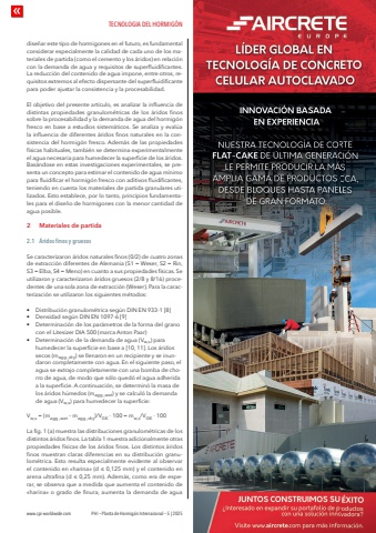 TECNOLOGIA DEL HORMIG%u00d3Nwww.cpi-worldwide.com PHI %u2013 Planta de Hormig%u00f3n Internacional %u2013 5 | 2025dise%u00f1ar este tipo de hormigones en el futuro, es fundamental considerar especialmente la calidad de cada uno de los materiales de partida (como el cemento y los %u00e1ridos) en relaci%u00f3n con la demanda de agua y requisitos de superfluidificantes. La reducci%u00f3n del contenido de agua impone, entre otros, requisitos extremos al efecto dispersante del superfluidificante para poder ajustar la consistencia y la procesabilidad.El objetivo del presente art%u00edculo, es analizar la influencia de distintas propiedades granulom%u00e9tricas de los %u00e1ridos finos sobre la procesabilidad y la demanda de agua del hormig%u00f3n fresco en base a estudios sistem%u00e1ticos. Se analiza y eval%u00faa la influencia de diferentes %u00e1ridos finos naturales en la consistencia del hormig%u00f3n fresco. Adem%u00e1s de las propiedades f%u00edsicas habituales, tambi%u00e9n se determina experimentalmente el agua necesaria para humedecer la superficie de los %u00e1ridos. Bas%u00e1ndose en estas investigaciones experimentales, se presenta un concepto para estimar el contenido de agua m%u00ednimo para fluidificar el hormig%u00f3n fresco con aditivos fluidificantes, teniendo en cuenta los materiales de partida granulares utilizados. Esto establece, por lo tanto, principios fundamentales para el dise%u00f1o de hormigones con la menor cantidad de agua posible. 2 Materiales de partida 2.1 %u00c1ridos finos y gruesosSe caracterizaron %u00e1ridos naturales finos (0/2) de cuatro zonas de extracci%u00f3n diferentes de Alemania (S1 = Weser, S2 = Rin, S3 = Elba, S4 = Meno) en cuanto a sus propiedades f%u00edsicas. Se utilizaron y caracterizaron %u00e1ridos gruesos (2/8 y 8/16) procedentes de una sola zona de extracci%u00f3n (Weser). Para la caracterizaci%u00f3n se utilizaron los siguientes m%u00e9todos:%u2022 Distribuci%u00f3n granulom%u00e9trica seg%u00fan DIN EN 933-1 [8]%u2022 Densidad seg%u00fan DIN EN 1097-6 [9]%u2022 Determinaci%u00f3n de los par%u00e1metros de la forma del grano con el Litesizer DIA 500 (marca Anton Paar)%u2022 Determinaci%u00f3n de la demanda de agua (Vw,s) para humedecer la superficie en base a [10, 11]. Los %u00e1ridos secos (magg.,dry) se llenaron en un recipiente y se inundaron completamente con agua. En el siguiente paso, el agua se extrajo completamente con una bomba de chorro de agua, de modo que s%u00f3lo qued%u00f3 el agua adherida a la superficie. A continuaci%u00f3n, se determin%u00f3 la masa de los %u00e1ridos h%u00famedos (magg.,wet) y se calcul%u00f3 la demanda de agua (Vw,s) para humedecer la superficie:Vw,s = (magg.,wet %u2013 magg.,dry)/VGK %u00b7 100 = mw,s/VGK %u00b7 100La fig. 1 (a) muestra las distribuciones granulom%u00e9tricas de los distintos %u00e1ridos finos. La tabla 1 muestra adicionalmente otras propiedades f%u00edsicas de los %u00e1ridos finos. Los distintos %u00e1ridos finos muestran claras diferencias en su distribuci%u00f3n granulom%u00e9trica. Esto resulta especialmente evidente al observar el contenido en %u00abharina%u00bb (d %u2264 0,125 mm) y el contenido en arena ultrafina (d %u2264 0,25 mm). Adem%u00e1s, como era de esperar, se observa que a medida que aumenta el contenido de %u00abharina%u00bb o grado de finura, aumenta la demanda de agua