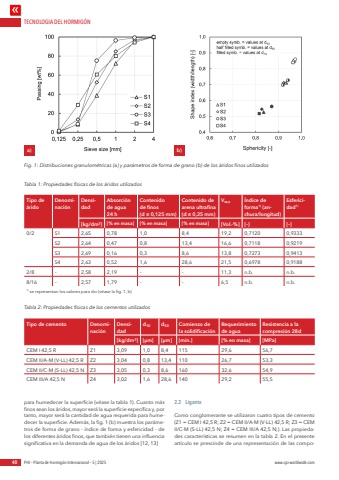 TECNOLOGIA DEL HORMIG%u00d3N40 PHI %u2013 Planta de Hormig%u00f3n Internacional %u2013 5 | 2025 www.cpi-worldwide.compara humedecer la superficie (v%u00e9ase la tabla 1). Cuanto m%u00e1s finos sean los %u00e1ridos, mayor ser%u00e1 la superficie espec%u00edfica y, por tanto, mayor ser%u00e1 la cantidad de agua requerida para humedecer la superficie. Adem%u00e1s, la fig. 1 (b) muestra los par%u00e1metros de forma de grano - %u00edndice de forma y esfericidad - de los diferentes %u00e1ridos finos, que tambi%u00e9n tienen una influencia significativa en la demanda de agua de los %u00e1ridos [12, 13]2.2 LiganteComo conglomerante se utilizaron cuatro tipos de cemento (Z1 = CEM I 42,5 R; Z2 = CEM II/A-M (V-LL) 42,5 R; Z3 = CEM II/C-M (S-LL) 42,5 N; Z4 = CEM III/A 42,5 N;). Las propiedades caracter%u00edsticas se resumen en la tabla 2. En el presente art%u00edculo se prescinde de una representaci%u00f3n de las compoFig. 1: Distribuciones granulom%u00e9tricas (a) y par%u00e1metros de forma de grano (b) de los %u00e1ridos finos utilizadosa) b)Tabla 1: Propiedades f%u00edsicas de los %u00e1ridos utilizadosTipo de %u00e1ridoDenominaci%u00f3nDensidadAbsorci%u00f3n de agua 24 hContenido de finos (d %u2264 0,125 mm)Contenido de arena ultrafina (d %u2264 0,25 mm)Vw,s %u00cdndice de forma1) (anchura/longitud)Esfericidad1)[kg/dm%u00b3] [% en masa] [% en masa] [% en masa] [Vol.-%] [%u2013] [%u2013]0/2 S1 2,65 0,78 1,0 8,4 19,2 0,7120 0,9333S2 2,64 0,47 0,8 13,4 16,6 0,7118 0,9219S3 2,69 0,16 0,3 8,6 13,8 0,7273 0,9413S4 2,63 0,52 1,6 28,6 21,5 0,6978 0,91882/8 %u2013 2,58 2,19 %u2013 %u2013 11,3 n.b. n.b.8/16 %u2013 2,57 1,79 %u2013 %u2013 6,5 n.b. n.b.1) se representan los valores para d50 (v%u00e9ase la fig. 1, b)Tabla 2: Propiedades f%u00edsicas de los cementos utilizadosTipo de cemento Denominaci%u00f3nDensidadd10 d50 Comienzo de la solidificaci%u00f3nRequerimiento de aguaResistencia a la compresi%u00f3n 28d[kg/dm%u00b3] [%u00b5m] [%u00b5m] [min.] [% en masa] [MPa]CEM I 42,5 R Z1 3,09 1,0 8,4 115 29,6 56,7CEM II/A-M (V-LL) 42,5 R Z2 3,04 0,8 13,4 110 26,7 53,3CEM II/C-M (S-LL) 42,5 N Z3 3,05 0,3 8,6 160 32,6 54,9CEM III/A 42,5 N Z4 3,02 1,6 28,6 140 29,2 55,5