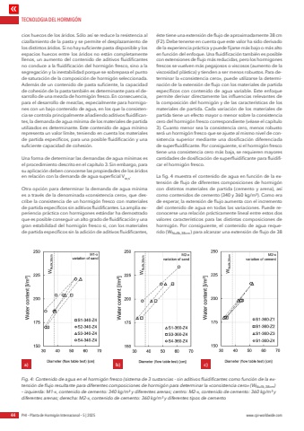 TECNOLOGIA DEL HORMIG%u00d3N44 PHI %u2013 Planta de Hormig%u00f3n Internacional %u2013 5 | 2025 www.cpi-worldwide.comcios huecos de los %u00e1ridos. S%u00f3lo as%u00ed se reduce la resistencia al cizallamiento de la pasta y se permite el desplazamiento de los distintos %u00e1ridos. Si no hay suficiente pasta disponible y los espacios huecos entre los %u00e1ridos no est%u00e1n completamente llenos, un aumento del contenido de aditivos fluidificantes no conduce a la fluidificaci%u00f3n del hormig%u00f3n fresco, sino a la segregaci%u00f3n y la inestabilidad porque se sobrepasa el punto de saturaci%u00f3n de la composici%u00f3n de hormig%u00f3n seleccionada.Adem%u00e1s de un contenido de pasta suficiente, la capacidad de cohesi%u00f3n de la pasta tambi%u00e9n es determinante para el desarrollo de una mezcla de hormig%u00f3n fresco. En consecuencia, para el desarrollo de mezclas, especialmente para hormigones con un bajo contenido de agua, en los que la consistencia se controla principalmente a%u00f1adiendo aditivos fluidificantes, la demanda de agua m%u00ednima de los materiales de partida utilizados es determinante. Este contenido de agua m%u00ednimo representa un valor l%u00edmite, teniendo en cuenta los materiales de partida espec%u00edficos, para una posible fluidificaci%u00f3n y una suficiente capacidad de cohesi%u00f3n.Una forma de determinar las demandas de agua m%u00ednimas es el procedimiento descrito en el cap%u00edtulo 3. Sin embargo, para su aplicaci%u00f3n deben conocerse las propiedades de los %u00e1ridos en relaci%u00f3n con la demanda de agua superficial Vw,s.Otra opci%u00f3n para determinar la demanda de agua m%u00ednima es a trav%u00e9s de la denominada %u00abconsistencia cero%u00bb, que describe la consistencia de un hormig%u00f3n fresco con materiales de partida espec%u00edficos sin aditivos fluidificantes. La amplia experiencia pr%u00e1ctica con hormigones est%u00e1ndar ha demostrado que es posible conseguir un alto grado de fluidificaci%u00f3n y una gran estabilidad del hormig%u00f3n fresco si, con los materiales de partida espec%u00edficos sin la adici%u00f3n de aditivos fluidificantes, %u00e9ste tiene una extensi%u00f3n de flujo de aproximadamente 38 cm (F2). Debe tenerse en cuenta que este valor ha sido derivado de la experiencia pr%u00e1ctica y puede fijarse m%u00e1s bajo o m%u00e1s alto en funci%u00f3n del enfoque. Una fluidificaci%u00f3n tambi%u00e9n es posible con extensiones de flujo m%u00e1s reducidas, pero los hormigones frescos se vuelven m%u00e1s pegajosos o viscosos (aumento de la viscosidad pl%u00e1stica) y tienden a ser menos robustos. Para determinar la %u00abconsistencia cero%u00bb, puede utilizarse la determinaci%u00f3n de la extensi%u00f3n de flujo con los materiales de partida espec%u00edficos con contenido de agua variable. Este enfoque permite derivar directamente las influencias relevantes de la composici%u00f3n del hormig%u00f3n y de las caracter%u00edsticas de los materiales de partida. Cada variaci%u00f3n de los materiales de partida tiene un efecto mayor o menor sobre la consistencia cero del hormig%u00f3n fresco correspondiente (v%u00e9ase el cap%u00edtulo 3). Cuanto menor sea la consistencia cero, menos robusto ser%u00e1 un hormig%u00f3n fresco que se ajuste al mismo nivel de consistencia superior mediante una dosificaci%u00f3n diferenciada de superfluidificante. Por consiguiente, si el hormig%u00f3n fresco tiene una consistencia cero m%u00e1s baja, se requieren mayores cantidades de dosificaci%u00f3n de superfluidificante para fluidificar el hormig%u00f3n fresco.La fig. 4 muestra el contenido de agua en funci%u00f3n de la extensi%u00f3n de flujo de diferentes composiciones de hormig%u00f3n con distintos materiales de partida (cemento y arena), as%u00ed como contenidos de cemento (340 y 360 kg/m%u00b3). Como era de esperar, la extensi%u00f3n de flujo aumenta con el incremento del contenido de agua en todas las variaciones. Puede reconocerse una relaci%u00f3n pr%u00e1cticamente lineal entre estos dos valores caracter%u00edsticos para las distintas composiciones de hormig%u00f3n. Por consiguiente, el contenido de agua requerido (WNullk,38cm) para alcanzar una extensi%u00f3n de flujo de 38 Fig. 4: Contenido de agua en el hormig%u00f3n fresco (sistema de 3 sustancias - sin aditivos fluidificantes como funci%u00f3n de la extensi%u00f3n de flujo resultante para diferentes composiciones de hormig%u00f3n para determinar la %u00abconsistencia cero%u00bb (WNullk,38cm) %u2013 izquierda: M1-x, contenido de cemento: 340 kg/m%u00b3 y diferentes arenas; centro: M2-x, contenido de cemento: 360 kg/m%u00b3 y diferentes arenas; derecha: M2-x, contenido de cemento: 360 kg/m%u00b3 y diferentes tipos de cementoa) b) c)