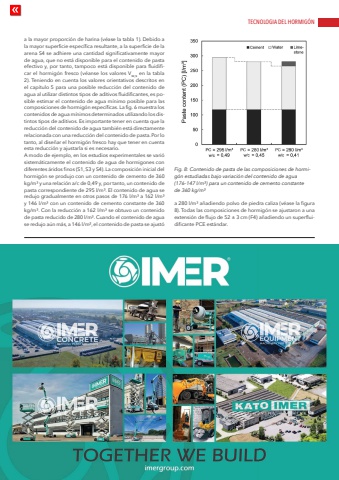 TECNOLOGIA DEL HORMIG%u00d3Nwww.cpi-worldwide.com PHI %u2013 Planta de Hormig%u00f3n Internacional %u2013 5 | 2025 47a la mayor proporci%u00f3n de harina (v%u00e9ase la tabla 1). Debido a la mayor superficie espec%u00edfica resultante, a la superficie de la arena S4 se adhiere una cantidad significativamente mayor de agua, que no est%u00e1 disponible para el contenido de pasta efectivo y, por tanto, tampoco est%u00e1 disponible para fluidificar el hormig%u00f3n fresco (v%u00e9anse los valores Vw,s en la tabla 2). Teniendo en cuenta los valores orientativos descritos en el cap%u00edtulo 5 para una posible reducci%u00f3n del contenido de agua al utilizar distintos tipos de aditivos fluidificantes, es posible estimar el contenido de agua m%u00ednimo posible para las composiciones de hormig%u00f3n espec%u00edficas. La fig. 6 muestra los contenidos de agua m%u00ednimos determinados utilizando los distintos tipos de aditivos. Es importante tener en cuenta que la reducci%u00f3n del contenido de agua tambi%u00e9n est%u00e1 directamente relacionada con una reducci%u00f3n del contenido de pasta. Por lo tanto, al dise%u00f1ar el hormig%u00f3n fresco hay que tener en cuenta esta reducci%u00f3n y ajustarla si es necesario.A modo de ejemplo, en los estudios experimentales se vari%u00f3 sistem%u00e1ticamente el contenido de agua de hormigones con diferentes %u00e1ridos finos (S1, S3 y S4). La composici%u00f3n inicial del hormig%u00f3n se produjo con un contenido de cemento de 360 kg/m%u00b3 y una relaci%u00f3n a/c de 0,49 y, por tanto, un contenido de pasta correspondiente de 295 l/m%u00b3. El contenido de agua se redujo gradualmente en otros pasos de 176 l/m%u00b3 a 162 l/m%u00b3 y 146 l/m%u00b3 con un contenido de cemento constante de 360 kg/m%u00b3. Con la reducci%u00f3n a 162 l/m%u00b3 se obtuvo un contenido de pasta reducido de 280 l/m%u00b3. Cuando el contenido de agua se redujo a%u00fan m%u00e1s, a 146 l/m%u00b2, el contenido de pasta se ajust%u00f3 a 280 l/m%u00b3 a%u00f1adiendo polvo de piedra caliza (v%u00e9ase la figura 8). Todas las composiciones de hormig%u00f3n se ajustaron a una extensi%u00f3n de flujo de 52 %u00b1 3 cm (F4) a%u00f1adiendo un superfluidificante PCE est%u00e1ndar.Fig. 8: Contenido de pasta de las composiciones de hormig%u00f3n estudiadas bajo variaci%u00f3n del contenido de agua (176-147 l/m%u00b3) para un contenido de cemento constante de 360 kg/m%u00b3