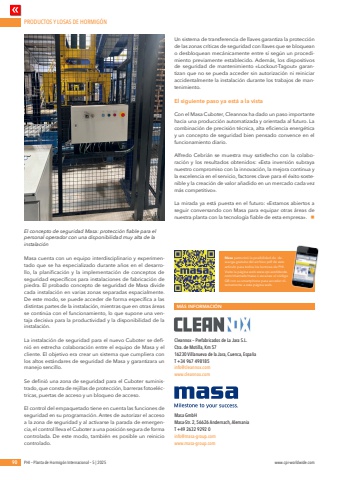 PRODUCTOS Y LOSAS DE HORMIG%u00d3N90 PHI %u2013 Planta de Hormig%u00f3n Internacional %u2013 5 | 2025 www.cpi-worldwide.comMasa cuenta con un equipo interdisciplinario y experimentado que se ha especializado durante a%u00f1os en el desarrollo, la planificaci%u00f3n y la implementaci%u00f3n de conceptos de seguridad espec%u00edficos para instalaciones de fabricaci%u00f3n de piedra. El probado concepto de seguridad de Masa divide cada instalaci%u00f3n en varias zonas separadas espacialmente. De este modo, se puede acceder de forma espec%u00edfica a las distintas partes de la instalaci%u00f3n, mientras que en otras %u00e1reas se contin%u00faa con el funcionamiento, lo que supone una ventaja decisiva para la productividad y la disponibilidad de la instalaci%u00f3n.La instalaci%u00f3n de seguridad para el nuevo Cuboter se defini%u00f3 en estrecha colaboraci%u00f3n entre el equipo de Masa y el cliente. El objetivo era crear un sistema que cumpliera con los altos est%u00e1ndares de seguridad de Masa y garantizara un manejo sencillo.Se defini%u00f3 una zona de seguridad para el Cuboter suministrado, que consta de rejillas de protecci%u00f3n, barreras fotoel%u00e9ctricas, puertas de acceso y un bloqueo de acceso. El control del empaquetado tiene en cuenta las funciones de seguridad en su programaci%u00f3n. Antes de autorizar el acceso a la zona de seguridad y al activarse la parada de emergencia, el control lleva el Cuboter a una posici%u00f3n segura de forma controlada. De este modo, tambi%u00e9n es posible un reinicio controlado.Un sistema de transferencia de llaves garantiza la protecci%u00f3n de las zonas cr%u00edticas de seguridad con llaves que se bloquean o desbloquean mec%u00e1nicamente entre s%u00ed seg%u00fan un procedimiento previamente establecido. Adem%u00e1s, los dispositivos de seguridad de mantenimiento %u00abLockout-Tagout%u00bb garantizan que no se pueda acceder sin autorizaci%u00f3n ni reiniciar accidentalmente la instalaci%u00f3n durante los trabajos de mantenimiento. El siguiente paso ya est%u00e1 a la vistaCon el Masa Cuboter, Cleannox ha dado un paso importante hacia una producci%u00f3n automatizada y orientada al futuro. La combinaci%u00f3n de precisi%u00f3n t%u00e9cnica, alta eficiencia energ%u00e9tica y un concepto de seguridad bien pensado convence en el funcionamiento diario.Alfredo Cebri%u00e1n se muestra muy satisfecho con la colaboraci%u00f3n y los resultados obtenidos: %u00abEsta inversi%u00f3n subraya nuestro compromiso con la innovaci%u00f3n, la mejora continua y la excelencia en el servicio, factores clave para el %u00e9xito sostenible y la creaci%u00f3n de valor a%u00f1adido en un mercado cada vez m%u00e1s competitivo%u00bb.La mirada ya est%u00e1 puesta en el futuro: %u00abEstamos abiertos a seguir conversando con Masa para equipar otras %u00e1reas de nuestra planta con la tecnolog%u00eda fiable de esta empresa%u00bb. nM%u00c1S INFORMACI%u00d3NCleannox %u2013 Prefabricados de La Jara S.L.Ctra. de Motilla, Km 57 16230 Villanueva de la Jara, Cuenca, Espa%u00f1aT +34 967 498185info@cleannox.comwww.cleannox.comMasa GmbHMasa-Str. 2, 56626 Andernach, AlemaniaT +49 2632 9292 0info@masa-group.comwww.masa-group.comEl concepto de seguridad Masa: protecci%u00f3n fiable para el personal operador con una disponibilidad muy alta de la instalaci%u00f3nMasa patrocin%u00f3 la posibilidad de descarga gratuita del archivo pdf de este art%u00edculo para todos los lectores de PHI. Visite la p%u00e1gina web www.cpi-worldwide.com/channels/masa o escanee el c%u00f3digo QR con su smartphone para acceder directamente a esta p%u00e1gina web.