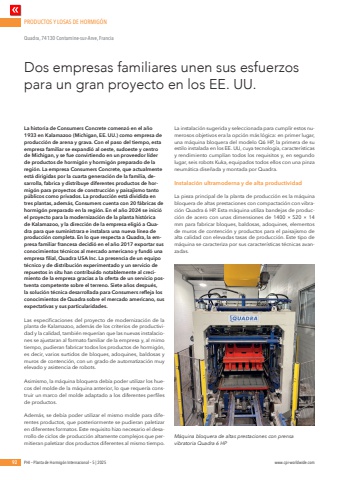 PRODUCTOS Y LOSAS DE HORMIG%u00d3N92 PHI %u2013 Planta de Hormig%u00f3n Internacional %u2013 5 | 2025 www.cpi-worldwide.comLa historia de Consumers Concrete comenz%u00f3 en el a%u00f1o 1933 en Kalamazoo (Michigan, EE. UU.) como empresa de producci%u00f3n de arena y grava. Con el paso del tiempo, esta empresa familiar se expandi%u00f3 al oeste, sudoeste y centro de Michigan, y se fue convirtiendo en un proveedor l%u00edder de productos de hormig%u00f3n y hormig%u00f3n preparado de la regi%u00f3n. La empresa Consumers Concrete, que actualmente est%u00e1 dirigidas por la cuarta generaci%u00f3n de la familia, desarrolla, fabrica y distribuye diferentes productos de hormig%u00f3n para proyectos de construcci%u00f3n y paisajismo tanto p%u00fablicos como privados. La producci%u00f3n est%u00e1 dividida en tres plantas, adem%u00e1s, Consumers cuenta con 20 f%u00e1bricas de hormig%u00f3n preparado en la regi%u00f3n. En el a%u00f1o 2024 se inici%u00f3 el proyecto para la modernizaci%u00f3n de la planta hist%u00f3rica de Kalamazoo, y la direcci%u00f3n de la empresa eligi%u00f3 a Quadra para que suministrara e instalara una nueva l%u00ednea de producci%u00f3n completa. En lo que respecta a Quadra, la empresa familiar francesa decidi%u00f3 en el a%u00f1o 2017 exportar sus conocimientos t%u00e9cnicos al mercado americano y fund%u00f3 una empresa filial, Quadra USA Inc. La presencia de un equipo t%u00e9cnico y de distribuci%u00f3n experimentado y un servicio de repuestos in situ han contribuido notablemente al crecimiento de la empresa gracias a la oferta de un servicio postventa competente sobre el terreno. Siete a%u00f1os despu%u00e9s, la soluci%u00f3n t%u00e9cnica desarrollada para Consumers refleja los conocimientos de Quadra sobre el mercado americano, sus expectativas y sus particularidades.Las especificaciones del proyecto de modernizaci%u00f3n de la planta de Kalamazoo, adem%u00e1s de los criterios de productividad y la calidad, tambi%u00e9n requer%u00edan que las nuevas instalaciones se ajustaran al formato familiar de la empresa y, al mimo tiempo, pudieran fabricar todos los productos de hormig%u00f3n, es decir, varios surtidos de bloques, adoquines, baldosas y muros de contenci%u00f3n, con un grado de automatizaci%u00f3n muy elevado y asistencia de robots.Asimismo, la m%u00e1quina bloquera deb%u00eda poder utilizar los huecos del molde de la m%u00e1quina anterior, lo que requer%u00eda construir un marco del molde adaptado a los diferentes perfiles de productos.Adem%u00e1s, se deb%u00eda poder utilizar el mismo molde para diferentes productos, que posteriormente se pudieran paletizar en diferentes formatos. Este requisito hizo necesario el desarrollo de ciclos de producci%u00f3n altamente complejos que permitieran paletizar dos productos diferentes al mismo tiempo.La instalaci%u00f3n sugerida y seleccionada para cumplir estos numerosos objetivos era la opci%u00f3n m%u00e1s l%u00f3gica: en primer lugar, una m%u00e1quina bloquera del modelo Q6 HP, la primera de su estilo instalada en los EE. UU, cuya tecnolog%u00eda, caracter%u00edsticas y rendimiento cumpl%u00edan todos los requisitos y, en segundo lugar, seis robots Kuka, equipados todos ellos con una pinza neum%u00e1tica dise%u00f1ada y montada por Quadra.Instalaci%u00f3n ultramoderna y de alta productividadLa pieza principal de la planta de producci%u00f3n es la m%u00e1quina bloquera de altas prestaciones con compactaci%u00f3n con vibraci%u00f3n Quadra 6 HP. Esta m%u00e1quina utiliza bandejas de producci%u00f3n de acero con unas dimensiones de 1400 %u00d7 520 %u00d7 14 mm para fabricar bloques, baldosas, adoquines, elementos de muros de contenci%u00f3n y productos para el paisajismo de alta calidad con elevadas tasas de producci%u00f3n. Este tipo de m%u00e1quina se caracteriza por sus caracter%u00edsticas t%u00e9cnicas avanzadas.Dos empresas familiares unen sus esfuerzos para un gran proyecto en los EE. UU.Quadra, 74130 Contamine-sur-Arve, FranciaM%u00e1quina bloquera de altas prestaciones con prensa vibratoria Quadra 6 HP