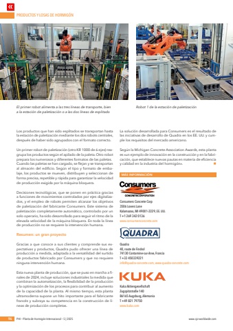PRODUCTOS Y LOSAS DE HORMIG%u00d3N96 PHI %u2013 Planta de Hormig%u00f3n Internacional %u2013 5 | 2025 www.cpi-worldwide.comLos productos que han sido esplitados se transportan hasta la estaci%u00f3n de paletizaci%u00f3n mediante los dos robots centrales, despu%u00e9s de haber sido agrupados con el formato correcto.Un primer robot de paletizaci%u00f3n (otro KR 1000 de 6 ejes) reagrupa los productos seg%u00fan el apilado de la paleta. Otro robot prepara los numerosos y diferentes formatos de las paletas.Cuando las paletas se han cargado, se flejan y se transportan al almac%u00e9n del edificio. Seg%u00fan el tipo y formato de embalaje, los productos se mueven, distribuyen y seleccionan de forma precisa, repetible y r%u00e1pida para garantizar la velocidad de producci%u00f3n exigida por la m%u00e1quina bloquera.Decisiones tecnol%u00f3gicas, que se ponen en pr%u00e1ctica gracias a funciones de movimientos controlados por ejes digitalizados, y el empleo de robots permiten alcanzar los objetivos de paletizaci%u00f3n del fabricante Consumers. Este sistema de paletizaci%u00f3n completamente autom%u00e1tico, controlado por un solo operario, ha sido desarrollado para seguir el ritmo de la elevada velocidad de la m%u00e1quina bloquera. En toda la l%u00ednea de producci%u00f3n no se requiere la intervenci%u00f3n humana.Resumen: un gran proyectoGracias a que conoce a sus clientes y comprende sus expectativas y productos, Quadra pudo ofrecer una l%u00ednea de producci%u00f3n a medida, adaptada a la versatilidad del surtido de productos fabricado por Consumers y que no requiere ninguna intervenci%u00f3n humana.Esta nueva planta de producci%u00f3n, que se puso en marcha a finales de 2024, incluye soluciones industriales la medida que combinan la automatizaci%u00f3n, la flexibilidad de la producci%u00f3n y la optimizaci%u00f3n de los procesos para contribuir al aumento de la capacidad de la planta. Al mismo tiempo, esta planta ultramoderna supone un hito importante para el fabricante franc%u00e9s y subraya su competencia en la construcci%u00f3n de l%u00edneas de producci%u00f3n completas.La soluci%u00f3n desarrollada para Consumers es el resultado de las iniciativas de desarrollo de Quadra en los EE. UU. y cumple los requisitos del mercado americano.Seg%u00fan la Michigan Concrete Association Awards, esta planta es %u00abun ejemplo de innovaci%u00f3n en la construcci%u00f3n y en la fabricaci%u00f3n, que establece nuevas pautas en materia de eficiencia y calidad en la industria del hormig%u00f3n%u00bb. nM%u00c1S INFORMACI%u00d3NConsumers Concrete Corp3506 Lovers LaneKalamazoo, MI 49001-2229, EE. UU.T +1 269 342 0136www.consumersconcrete.comQuadra40, route de Findrol74130 Contamine-sur-Arve, FranciaT +33 450339221info@quadra-concrete.com, www.quadra-concrete.comKuka AktiengesellschaftZugspitzstra%u00dfe 14086165 Augsburg, AlemaniaT +49 821 79750www.kuka.comEl primer robot alimenta a las tres l%u00edneas de transporte, bien a la estaci%u00f3n de paletizaci%u00f3n o a las dos l%u00edneas de esplitadoRobot 1 de la estaci%u00f3n de paletizaci%u00f3n