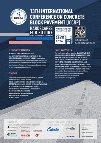 13TH INTERNATIONAL CONFERENCE ON CONCRETE BLOCK PAVEMENT [ICCBP]HARDSCAPESFOR FUTUREHYDERABADTELANGANA, INDIA09%u201310 APRIL2026 THE CONFERENCE HARDSCAPES FOR FUTURE, the 13TH INTERNATIONAL CONFERENCE ON CONCRETE BLOCK PAVEMENT (ICCBP) is organized as a part of a long-term series of events to discuss and promote technical and scientific progress with recent developments/ issues in the design and construction of block pavements worldwide. PARTICIPANTS The conference brings together BLOCK PAVEMENT RESEARCHERS, ENGINEERS, CONSULTANTS AND MANUFACTURERS, LANDSCAPE ARCHITECTS, ARCHITECTS, URBAN DESIGNERS, PLANNERS, SUPPLIERS, VENDORS, CONSTRUCTION AND INFRASTRUCTURE COMPANIES, ACADEMICIANS AND RESEARCHERS, GOVERNMENT AUTHORITIES, REAL ESTATE DEVELOPERS & ASSOCIATED NGOsto enrich the discourse by exploring new ideas, encouraging collaborations with designers and envisioning practical solutions for sustainable development. iccbp.pbma.in[Email]: iccbp@pbma.inTHEMEThe conference covers a diverse array of themes and sub themes. These include:ROAD CONSTRUCTION | PAVEMENT DESIGN | STREET & LANDSCAPE DESIGN | URBAN PLANNING & TRANSPORTATION INFRASTRUCTURE | INNOVATIONS & RESEARCH | ECOLOGICAL & SUSTAINABILITY ASPECTS | PERFORMANCE & MAINTENANCE | PRODUCTION TECHNOLOGY & MATERIALSHOSTED BYPAVERS AND BLOCKS MANUFACTURERS ASSOCIATIONwww.pbma.in info@pbma.in COLLABORATOR INTERNATIONALMEDIA PARTNERDOMESTICMEDIA PARTNERCONFERENCE SUPPORTED BYPLATINUM SPONSOR DIAMOND SPONSOR GOLD SPONSORKBT MachineriesBengaluru Sagar Cements Ltd., HyderabadKobra Formen GmbH