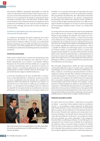 ICCX SPECIAL10 PBI %u2013 Pr%u00e9fa B%u00e9ton International %u2013 5 | 2025 www.cpi-worldwide.comdes relations d%u2019affaires. L%u2019exposition sp%u00e9cialis%u00e9e n%u2019a cess%u00e9 de cro%u00eetre ces derni%u00e8res ann%u00e9es et atteint cette ann%u00e9e encore un nouveau record. Des entreprises du monde entier se pr%u00e9senteront sur une soixantaine de stands et proposeront leurs concepts et solutions pour une fabrication moderne d%u2019%u00e9l%u00e9ments de b%u00e9ton. Des entreprises issues principalement de la construction d%u2019installations, mais aussi du march%u00e9 des pi%u00e8ces d%u2019usure et de rechange ainsi que de la chimie du b%u00e9ton seront pr%u00e9sentes.Conf%u00e9rence sp%u00e9cialis%u00e9e avec des intervenants reconnus du monde entierLa conf%u00e9rence sp%u00e9cialis%u00e9e fait partie int%u00e9grante de la s%u00e9rie d%u2019%u00e9v%u00e9nements de l%u2019ICCX et a beaucoup %u00e0 offrir. Le programme de la conf%u00e9rence offrira %u00e0 nouveau une multitude de solutions pratiques pour les d%u00e9fis quotidiens de la production de b%u00e9ton, mais mettra %u00e9galement en lumi%u00e8re les aspects scientifiques et pr%u00e9sentera les d%u00e9veloppements actuels de la recherche. Construction parasismiqueCette ann%u00e9e, le th%u00e8me de la construction parasismique sera %u00e0 nouveau au centre de l%u2019attention, avec cette fois-ci une r%u00e9flexion approfondie sur le contenu. Le professeur Stefano Pampanin de l%u2019Universit%u00e9 de Rome (Italie) est un expert de renomm%u00e9e internationale dans ce domaine et animera un atelier intitul%u00e9 %u00ab La prochaine g%u00e9n%u00e9ration de constructions pr%u00e9fabriqu%u00e9es en b%u00e9ton %u00e0 faible risque de dommages : opportunit%u00e9s dans les r%u00e9gions m%u00e9diterran%u00e9ennes %u00bb.La s%u00e9rie de tremblements de terre de 2010-2011 %u00e0 Canterbury, en Nouvelle-Z%u00e9lande, a clairement montr%u00e9 qu%u2019il existe un %u00e9cart consid%u00e9rable entre les attentes de la soci%u00e9t%u00e9 et la r%u00e9sistance r%u00e9elle des b%u00e2timents modernes aux s%u00e9ismes. La s%u00e9curit%u00e9 de la vie %u00e0 elle seule ne suffit pas aux soci%u00e9t%u00e9s modernes ; un changement de paradigme dans les crit%u00e8res et les objectifs de conception bas%u00e9s sur la performance vers une philosophie et une technologie de conception ax%u00e9es sur la limitation ou le moindre dommage est n%u00e9cessaire de toute urgence. La sensibilisation accrue du public/des locataires, des propri%u00e9taires de b%u00e2timents, des collectivit%u00e9s territoriales et des assureurs/r%u00e9assureurs aux graves cons%u00e9quences %u00e9conomiques des s%u00e9ismes de moyenne %u00e0 forte intensit%u00e9 en termes de dommages/co%u00fbts/temps d%u2019arr%u00eat a en effet encourag%u00e9 et facilit%u00e9 l%u2019acceptation et la mise en %u0153uvre plus larges de technologies rentables visant %u00e0 limiter ou %u00e0 r%u00e9duire les dommages.La construction de communaut%u00e9s plus s%u00fbres et plus r%u00e9silientes est en effet reconnue comme un objectif primordial des politiques et des pratiques de r%u00e9duction des risques. Un environnement b%u00e2ti %u00e0 r%u00e9sistance %u00e9lev%u00e9e, y compris les structures et les infrastructures, constituerait une %u00e9tape importante vers la r%u00e9alisation de cet objectif. La barre a %u00e9t%u00e9 plac%u00e9e beaucoup plus haut avec l%u2019exigence d%u2019acc%u00e9l%u00e9rer le d%u00e9veloppement de ce que le public appellerait le syst%u00e8me de construction %u00ab ultime %u00bb, capable de r%u00e9sister sans dommage majeur aux secousses d%u2019un s%u00e9isme violent. La pr%u00e9sentation donne un aper%u00e7u des progr%u00e8s r%u00e9cents r%u00e9alis%u00e9s au cours des trente derni%u00e8res ann%u00e9es gr%u00e2ce %u00e0 des recherches approfondies, au d%u00e9veloppement et %u00e0 la mise en %u0153uvre d%u2019un syst%u00e8me de construction int%u00e9gr%u00e9 %u00e0 faible dommage bas%u00e9 sur la technologie des %u00e9l%u00e9ments pr%u00e9fabriqu%u00e9s en b%u00e9ton, y compris l%u2019ossature de la superstructure et les %u00e9l%u00e9ments non structuraux.Des exemples d%u2019applications r%u00e9elles de cette technologie en Nouvelle-Z%u00e9lande et dans le monde entier, utilisant des assemblages secs et ductiles en %u00e9l%u00e9ments pr%u00e9fabriqu%u00e9s en b%u00e9ton, bas%u00e9s sur une technique de pr%u00e9contrainte non li%u00e9e et int%u00e9grant certaines des derni%u00e8res solutions techniques innovantes d%u00e9velopp%u00e9es en laboratoire, sont pr%u00e9sent%u00e9s comme un exemple encourageant de transfert r%u00e9ussi de l%u2019approche de la conception sismique bas%u00e9e sur la performance et de la technologie avanc%u00e9e de la th%u00e9orie %u00e0 la pratique, conform%u00e9ment %u00e0 l%u2019objectif global de r%u00e9silience des b%u00e2timents. Des %u00e9valuations co%u00fbts/b%u00e9n%u00e9fices/performances sont %u00e9galement pr%u00e9sent%u00e9es, ainsi que des consid%u00e9rations sur les opportunit%u00e9s et les perspectives de d%u00e9veloppement et de mise en %u0153uvre %u00e0 plus grande %u00e9chelle de la prochaine g%u00e9n%u00e9ration de structures pr%u00e9fabriqu%u00e9es en b%u00e9ton dans la r%u00e9gion m%u00e9diterran%u00e9enne.Production de produits en b%u00e9tonUn autre point fort est l%u2019atelier %u00ab Fabrication de produits en b%u00e9ton %u2013 %u00e0 quoi faut-il faire attention dans les conditions d%u2019usine ? %u00bb. Le professeur J%u00fcrgen Oecknick de PSA Zurich Area GmbH donnera ici pour la premi%u00e8re fois %u00e0 l%u2019ICCX North Africa un aper%u00e7u de son exp%u00e9rience internationale de plus de 40 ans dans l%u2019industrie des mat%u00e9riaux de construction et en tant que professeur d%u2019universit%u00e9 dans le domaine de la technique des proc%u00e9d%u00e9s de construction. Les produits en b%u00e9ton sont des produits de masse r%u00e9pondant %u00e0 des exigences fonctionnelles et esth%u00e9tiques %u00e9lev%u00e