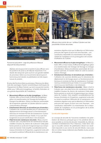 PRODUITS EN B%u00c9TON100 PBI %u2013 Pr%u00e9fa B%u00e9ton International %u2013 5 | 2025 www.cpi-worldwide.comd%u00e9place ainsi toujours de la mani%u00e8re la plus efficace vers les positions de prise ou de d%u00e9pose respectives. Il en r%u00e9sulte des temps de cycle courts et une grande stabilit%u00e9 du processus. Gr%u00e2ce aux mouvements dynamiques et harmonieux du Cuboter, la palettisation est tr%u00e8s respectueuse du produit.En plus des fonctions li%u00e9es au processus, Cleannox tire d%u00e9sormais des avantages d'autres caract%u00e9ristiques techniques de l'%u00e9quipement du Masa Cuboter, qui sont con%u00e7ues de mani%u00e8re cibl%u00e9e pour l'efficacit%u00e9 %u00e9nerg%u00e9tique, la facilit%u00e9 d'entretien et une grande disponibilit%u00e9 de l'installation :%u2022 Mouvement efficace sur le plan %u00e9nerg%u00e9tique : le Masa Cuboter offre un haut niveau d'efficacit%u00e9 %u00e9nerg%u00e9tique gr%u00e2ce %u00e0 la transformation de l'%u00e9nergie de freinage en %u00e9nergie d'acc%u00e9l%u00e9ration. Gr%u00e2ce %u00e0 la s%u00e9lection automatis%u00e9e de la trajectoire optimale, le Cuboter r%u00e9duit en outre la consommation d'%u00e9nergie.%u2022 Entra%u00eenement silencieux et n%u00e9cessitant peu d'entretien : l'utilisation de courroies dent%u00e9es pour le m%u00e9canisme de d%u00e9placement et de levage assure un fonctionnement silencieux et minimise les frais de maintenance. Contrairement aux entra%u00eenements par cha%u00eene, il n'y a pas d'allongement et aucune lubrification n'est n%u00e9cessaire.%u2022 Plate-forme de maintenance s%u00e9curis%u00e9e : Masa a livr%u00e9 le Cuboter avec une plate-forme de maintenance robuste, install%u00e9e %u00e0 hauteur du chemin de roulement. Cette plateforme permet un acc%u00e8s s%u00fbr et ergonomique aux composants du Cuboter. Cela simplifie consid%u00e9rablement les travaux d'entretien et d'inspection, augmente la s%u00e9curit%u00e9 au travail et am%u00e9liore l'efficacit%u00e9 de la maintenance. Les entretiens r%u00e9guliers ainsi que la d%u00e9tection et l'%u00e9limination pr%u00e9coces des signes d'usure sont ainsi favoris%u00e9s %u2013 une contribution essentielle %u00e0 la maximisation de la disponibilit%u00e9 de l'installation et %u00e0 la prolongation de la dur%u00e9e d%u2019utilisation du Cuboter.%u2022 Mouvement efficace sur le plan %u00e9nerg%u00e9tique : le Masa Cuboter offre un haut niveau d'efficacit%u00e9 %u00e9nerg%u00e9tique gr%u00e2ce %u00e0 la transformation de l'%u00e9nergie de freinage en %u00e9nergie d'acc%u00e9l%u00e9ration. Gr%u00e2ce %u00e0 la s%u00e9lection automatis%u00e9e de la trajectoire optimale, le Cuboter r%u00e9duit en outre la consommation d'%u00e9nergie.%u2022 Entra%u00eenement silencieux et n%u00e9cessitant peu d'entretien : l'utilisation de courroies dent%u00e9es pour le m%u00e9canisme de d%u00e9placement et de levage assure un fonctionnement silencieux et minimise les frais de maintenance. Contrairement aux entra%u00eenements par cha%u00eene, il n'y a pas d'allongement et aucune lubrification n'est n%u00e9cessaire.%u2022 Plate-forme de maintenance s%u00e9curis%u00e9e : Masa a livr%u00e9 le Cuboter avec une plate-forme de maintenance robuste, install%u00e9e %u00e0 hauteur du chemin de roulement. Cette plateforme permet un acc%u00e8s s%u00fbr et ergonomique aux composants du Cuboter. Cela simplifie consid%u00e9rablement les travaux d'entretien et d'inspection, augmente la s%u00e9curit%u00e9 au travail et am%u00e9liore l'efficacit%u00e9 de la maintenance. Les entretiens r%u00e9guliers ainsi que la d%u00e9tection et l'%u00e9limination pr%u00e9coces des signes d'usure sont ainsi favoris%u00e9s %u2013 une contribution essentielle %u00e0 la maximisation de la disponibilit%u00e9 de l'installation et %u00e0 la prolongation de la dur%u00e9e d%u2019utilisation du Cuboter.La s%u00e9curit%u00e9 repens%u00e9eLe concept de s%u00e9curit%u00e9 de l'ancienne installation de palettisation de Cleannox pr%u00e9voyait que si l'on p%u00e9n%u00e9trait dans la zone sensible en termes de s%u00e9curit%u00e9, l'ensemble du c%u00f4t%u00e9 sec s'arr%u00eatait imm%u00e9diatement. Pour Cleannox, il %u00e9tait donc clair que la nouvelle solution de palettisation devait non seulement r%u00e9pondre %u00e0 une norme de s%u00e9curit%u00e9 %u00e9lev%u00e9e, mais aussi %u00eatre en m%u00eame temps nettement plus flexible et plus proche de la pratique.Puissant et polyvalent : cage de pr%u00e9hension Masa et dispositif de retournementEfficace %u00e0 tous points de vue : le Masa Cuboter avec des possibilit%u00e9s d'acc%u00e8s s%u00e9curis%u00e9es