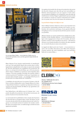 PRODUITS EN B%u00c9TON102 PBI %u2013 Pr%u00e9fa B%u00e9ton International %u2013 5 | 2025 www.cpi-worldwide.comMasa dispose d'une %u00e9quipe exp%u00e9riment%u00e9e et interdisciplinaire qui s'est sp%u00e9cialis%u00e9e depuis des ann%u00e9es dans le d%u00e9veloppement, la planification et la mise en %u0153uvre de concepts de s%u00e9curit%u00e9 sp%u00e9cifiques aux installations de production de blocs. Le concept de s%u00e9curit%u00e9 Masa, qui a fait ses preuves, divise chaque installation en plusieurs zones s%u00e9par%u00e9es dans l'espace. Il est ainsi possible d'acc%u00e9der de mani%u00e8re cibl%u00e9e %u00e0 certaines parties de l'installation, tandis que l'exploitation se poursuit dans d'autres zones %u2013 un avantage d%u00e9cisif pour la productivit%u00e9 et la disponibilit%u00e9 de l'installation.L'installation de s%u00e9curit%u00e9 pour le nouveau Cuboter a %u00e9t%u00e9 d%u00e9finie en %u00e9troite collaboration entre l'%u00e9quipe Masa et le client. L'objectif %u00e9tait d'obtenir un syst%u00e8me qui r%u00e9ponde %u00e0 la fois aux normes de s%u00e9curit%u00e9 %u00e9lev%u00e9es de Masa et qui garantisse une utilisation conviviale.Une Safety-Zone a %u00e9t%u00e9 d%u00e9finie pour le Cuboter livr%u00e9 %u2013 compos%u00e9e de grilles de protection, de barri%u00e8res lumineuses, de portes d'acc%u00e8s et d'une barri%u00e8re d'acc%u00e8s.La commande de la palettisation tient compte des fonctions de s%u00e9curit%u00e9 dans sa programmation. Avant de lib%u00e9rer l'acc%u00e8s %u00e0 la zone de s%u00e9curit%u00e9 et lors du d%u00e9clenchement de l'arr%u00eat d'urgence, la commande am%u00e8ne le Cuboter de mani%u00e8re contr%u00f4l%u00e9e dans une position s%u00fbre. Le red%u00e9marrage contr%u00f4l%u00e9 est ainsi %u00e9galement possible.Un syst%u00e8me de transfert de cl%u00e9 assure la protection des zones de s%u00e9curit%u00e9 critiques avec des cl%u00e9s qui sont verrouill%u00e9es ou lib%u00e9r%u00e9es m%u00e9caniquement l'une par rapport %u00e0 l'autre selon une proc%u00e9dure pr%u00e9d%u00e9finie. En compl%u00e9ment, des s%u00e9curit%u00e9s de maintenance %u00ab Lockout-Tagout %u00bb garantissent qu'aucun acc%u00e8s non autoris%u00e9 ou remise en marche involontaire de l'installation ne puisse avoir lieu lors de travaux de maintenance.La prochaine %u00e9tape est d%u00e9j%u00e0 en vueAvec le Masa Cuboter, Cleannox a fait un pas important vers une production automatis%u00e9e orient%u00e9e vers l'avenir. La combinaison de la pr%u00e9cision technique, d'une grande efficacit%u00e9 %u00e9nerg%u00e9tique et d'un concept de s%u00e9curit%u00e9 bien pens%u00e9 convainc au quotidien.Alfredo Cebri%u00e1n se montre extr%u00eamement satisfait de la collaboration et des r%u00e9sultats obtenus : %u00ab cet investissement souligne notre engagement en faveur de l'innovation, de l'am%u00e9lioration continue et de l'excellence du service %u2013 des facteurs cl%u00e9s pour une r%u00e9ussite durable et la cr%u00e9ation de valeur ajout%u00e9e sur un march%u00e9 de plus en plus concurrentiel. %u00bbLe regard est d%u00e9j%u00e0 tourn%u00e9 vers l'avenir : %u00ab nous sommes ouverts %u00e0 de nouvelles discussions avec Masa afin d'%u00e9quiper d'autres secteurs de notre installation avec une technique fiable de la maison Masa. %u00bb nAUTRES INFORMATIONSCleannox %u2013 Prefabricados de La Jara S.L.Ctra. de Motilla, Km 57 16230 Villanueva de la Jara, Cuenca, EspagneT +34 967 498185info@cleannox.comwww.cleannox.comMasa GmbHMasa-Str. 256626 Andernach, AllemagneT +49 2632 9292 0info@masa-group.comwww.masa-group.comLe concept Masa Safety %u2013 une protection fiable pour le personnel op%u00e9rateur avec une tr%u00e8s grande disponibilit%u00e9 de l'installation Gr%u00e2ce %u00e0 Masa, tous les lecteurs de PBI ont la possibilit%u00e9 de t%u00e9l%u00e9charger cet article en version pdf. Veuillez consulter le site internet www.cpi-worldwide.com/channels/masa ou scanner le code QR avec votre smartphone pour acc%u00e9der directement %u00e0 ce site internet.