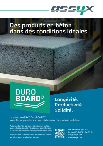 Long%u00e9vit%u00e9. Productivit%u00e9.Solidit%u00e9.ASSYX GmbH & Co. KGTel. +49 (0) 26 32 - 94 75 10info@assyx.comwww.assyx.comAvec une finition parfaite, les meilleurs mat%u00e9riaux et des d%u00e9cennies d%u2018exp%u00e9rience sur le terrain, nous vous garantissons la long%u00e9vit%u00e9 et la pr%u00e9cision.Avec l%u2018ASSYX DuroBOARD%u00ae, misez sur la qualit%u00e9 qui place votre production au top.La planche ASSYX DuroBOARD%u00ae: la meilleure planche pour votre fabrication de produits en b%u00e9ton.Des produits en b%u00e9ton dans des conditions id%u00e9ales.