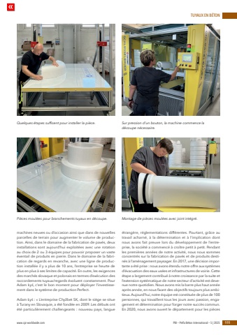TUYAUX EN B%u00c9TONwww.cpi-worldwide.com PBI %u2013 Pr%u00e9fa B%u00e9ton International %u2013 5 | 2025 111machines neuves ou d%u2019occasion ainsi que dans de nouvelles parcelles de terrain pour augmenter le volume de production. Ainsi, dans le domaine de la fabrication de pav%u00e9s, deux installations sont aujourd%u2019hui exploit%u00e9es avec une rotation au choix de 2 ou 3 %u00e9quipes pour pouvoir proposer un vaste %u00e9ventail de produits en pierre. Dans le domaine de la fabrication de regards en revanche, avec une ligne de production install%u00e9e il y a plus de 10 ans, l%u2019entreprise se heurte de plus en plus %u00e0 ses limites de capacit%u00e9. En outre, les exigences des march%u00e9s slovaque et polonais en termes d%u2019ex%u00e9cution des raccordements tuyaux/regards %u00e9voluent constamment. Pour Adam %u0141y%u015b, c%u2019est le bon moment pour d%u00e9ployer l%u2019investissement dans le syst%u00e8me de production Perfect.Adam %u0141y%u015b : %u00ab L%u2019entreprise Chy%u017ebet SK, dont le si%u00e8ge se situe %u00e0 Turany en Slovaquie, a %u00e9t%u00e9 fond%u00e9e en 2009. Les d%u00e9buts ont %u00e9t%u00e9 particuli%u00e8rement challengeants : nouveau pays, langue %u00e9trang%u00e8re, r%u00e9glementations diff%u00e9rentes. Pourtant, gr%u00e2ce au travail acharn%u00e9, %u00e0 la d%u00e9termination et %u00e0 l%u2019implication dont nous avons fait preuve lors du d%u00e9veloppement de l%u2019entreprise, la soci%u00e9t%u00e9 a commenc%u00e9 %u00e0 cro%u00eetre petit %u00e0 petit. Pendant les premi%u00e8res ann%u00e9es de notre activit%u00e9, nous nous sommes concentr%u00e9s sur la fabrication de pav%u00e9s et de produits destin%u00e9s %u00e0 l%u2019am%u00e9nagement paysager. En 2017, une d%u00e9cision importante a %u00e9t%u00e9 prise : nous avons %u00e9tendu notre offre aux syst%u00e8mes d%u2019%u00e9vacuation des eaux us%u00e9es et infrastructures de voirie. Cette %u00e9tape a largement contribu%u00e9 %u00e0 notre croissance par la suite et l%u2019extension syst%u00e9matique de notre secteur d%u2019activit%u00e9 est devenue notre quotidien. Nous avons mis la barre plus haut ann%u00e9e apr%u00e8s ann%u00e9e, en nous fixant des objectifs toujours plus ambitieux. Aujourd%u2019hui, notre %u00e9quipe est constitu%u00e9e de plus de 100 personnes, qui travaillent tous les jours avec passion, engagement et d%u00e9termination pour forger notre succ%u00e8s commun. En 2020, nous avons ouvert le d%u00e9partement pour les pi%u00e8ces Quelques %u00e9tapes suffisent pour installer la pi%u00e8ce.Pi%u00e8ces moul%u00e9es pour branchements tuyaux en d%u00e9coupe.Sur pression d%u2019un bouton, la machine commence la d%u00e9coupe n%u00e9cessaire.Montage de pi%u00e8ces moul%u00e9es avec joint int%u00e9gr%u00e9.