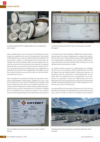 TUYAUX EN B%u00c9TON112 PBI %u2013 Pr%u00e9fa B%u00e9ton International %u2013 5 | 2025 www.cpi-worldwide.comb%u00e9ton pr%u00e9fabriqu%u00e9es, au sein duquel nous fabriquons entre autres des syst%u00e8mes de murs de sout%u00e8nement, des pi%u00e8ces pr%u00e9fabriqu%u00e9es pour ponts et d%u2019autres %u00e9l%u00e9ments destin%u00e9s %u00e0 la construction routi%u00e8re. Le d%u00e9veloppement et l%u2019expansion de Chy%u017ebet SK ont %u00e9t%u00e9 possibles gr%u00e2ce %u00e0 toute l%u2019%u00e9quipe. Des ann%u00e9es de recherche nous ont permis de constituer une %u00e9quipe extraordinaire, qui pourrait %u00e0 elle seule faire l%u2019objet d%u2019un article. Je remercie tous ses membres pour leur implication au quotidien, leur loyaut%u00e9, leur engagement sans faille et, pour bon nombre d%u2019entre eux, pour leur amiti%u00e9, car ils font maintenant partie de ma vie. %u00bbAvec le syst%u00e8me de production Perfect du fournisseur autrichien Schl%u00fcsselbauer Technology, Chy%u017ebet SK a pour ainsi dire combl%u00e9 une lacune dans sa politique de produits, dont tous les segments sont ax%u00e9s sur une qualit%u00e9 maximale. La r%u00e9alisation personnalis%u00e9e des cunettes et des positions du branchement tuyau est tr%u00e8s importante sur le march%u00e9 de Chy%u017ebet SK. La complexit%u00e9 de la cunette est %u00e9lev%u00e9e si l%u2019on compare avec les autres pays d%u2019Europe. Les embouchures des tuyaux %u00e0 raccorder doivent %u00eatre r%u00e9alis%u00e9es %u00e0 diff%u00e9rentes hauteurs directement dans la cunette, et %u00e9galement au-dessus de celle-ci. Dans les deux cas, un branchement tuyau %u00e0 l%u2019%u00e9tanch%u00e9it%u00e9 fiable est indispensable. L%u2019adaptation des cunettes %u00e0 diff%u00e9rents niveaux d%u2019entr%u00e9e et de sortie doit %u00eatre facile %u00e0 r%u00e9aliser sur le site de fabrication de produits en b%u00e9ton.Le syst%u00e8me Perfect assiste les collaborateurs de Chy%u017ebet SK pour tous les processus. D%u00e8s la planification du fond de regard, tous les d%u00e9tails relatifs %u00e0 l%u2019ex%u00e9cution peuvent, en quelques clics, %u00eatre import%u00e9s ou cr%u00e9%u00e9s s%u00e9par%u00e9ment. Le syst%u00e8me offre une assistance pour la planification de la production au quotidien, et pour les collaborateurs lors de la fabrication de tous les moules de cunette. Une fois les pi%u00e8ces moul%u00e9es n%u00e9cessaires s%u00e9lectionn%u00e9es, il suffit d%u2019appuyer sur un bouton pour lancer les d%u00e9coupes. Les pi%u00e8ces EPS sont d%u00e9coup%u00e9es %u00e0 l%u2019aide de scies %u00e0 fil chaud et les %u00e9l%u00e9ments s%u00e9par%u00e9s sont assembl%u00e9s avec de la colle %u00e0 chaud pour cr%u00e9er la cunette. %u00c0 cette fin, le syst%u00e8me de production Cunette n%u00e9gative EPS compl%u00e8te pr%u00eate pour la pr%u00e9paration des moules.Le planning de la production du jour est toujours %u00e0 port%u00e9e de regardTous les d%u00e9tails importants du produit sont bien visibles dessus.Stockage des fonds de regards monoblocs fabriqu%u00e9s selon le projet%u00a9 Chy%u017ebet SK