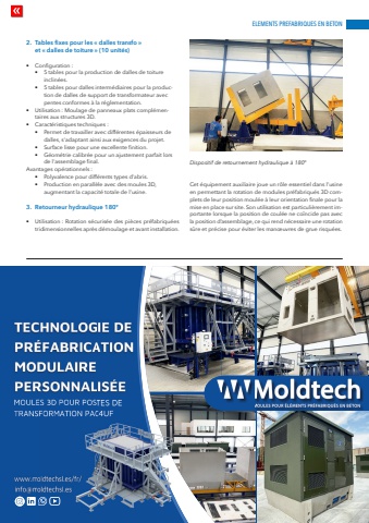 ELEMENTS PREFABRIQUES EN BETONwww.cpi-worldwide.com PBI %u2013 Pr%u00e9fa B%u00e9ton International %u2013 5 | 2025 1172. Tables fixes pour les %u00ab dalles transfo %u00bb et %u00ab dalles de toiture %u00bb (10 unit%u00e9s)%u2022 Configuration :%u2022 5 tables pour la production de dalles de toiture inclin%u00e9es.%u2022 5 tables pour dalles interm%u00e9diaires pour la production de dalles de support de transformateur avec pentes conformes %u00e0 la r%u00e9glementation.%u2022 Utilisation : Moulage de panneaux plats compl%u00e9mentaires aux structures 3D.%u2022 Caract%u00e9ristiques techniques :%u2022 Permet de travailler avec diff%u00e9rentes %u00e9paisseurs de dalles, s'adaptant ainsi aux exigences du projet.%u2022 Surface lisse pour une excellente finition.%u2022 G%u00e9om%u00e9trie calibr%u00e9e pour un ajustement parfait lors de l'assemblage final.Avantages op%u00e9rationnels :%u2022 Polyvalence pour diff%u00e9rents types d'abris.%u2022 Production en parall%u00e8le avec des moules 3D, augmentant la capacit%u00e9 totale de l'usine.3. Retourneur hydraulique 180%u00b0%u2022 Utilisation : Rotation s%u00e9curis%u00e9e des pi%u00e8ces pr%u00e9fabriqu%u00e9es tridimensionnelles apr%u00e8s d%u00e9moulage et avant installation.Cet %u00e9quipement auxiliaire joue un r%u00f4le essentiel dans l%u2019usine en permettant la rotation de modules pr%u00e9fabriqu%u00e9s 3D complets de leur position moul%u00e9e %u00e0 leur orientation finale pour la mise en place sur site. Son utilisation est particuli%u00e8rement importante lorsque la position de coul%u00e9e ne co%u00efncide pas avec la position d%u2019assemblage, ce qui rend n%u00e9cessaire une rotation s%u00fbre et pr%u00e9cise pour %u00e9viter les man%u0153uvres de grue risqu%u00e9es.Dispositif de retournement hydraulique %u00e0 180%u00ba