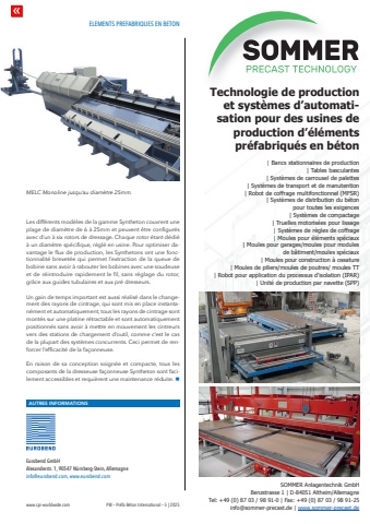 ELEMENTS PREFABRIQUES EN BETONwww.cpi-worldwide.com PBI %u2013 Pr%u00e9fa B%u00e9ton International %u2013 5 | 2025Les diff%u00e9rents mod%u00e8les de la gamme Syntheton couvrent une plage de diam%u00e8tre de 6 %u00e0 25mm et peuvent %u00eatre configur%u00e9s avec d%u2019un %u00e0 six rotors de dressage. Chaque rotor %u00e9tant d%u00e9di%u00e9 %u00e0 un diam%u00e8tre sp%u00e9cifique, r%u00e9gl%u00e9 en usine. Pour optimiser davantage le flux de production, les Synthetons ont une fonctionnalit%u00e9 brevet%u00e9e qui permet l%u2019extraction de la queue de bobine sans avoir %u00e0 rabouter les bobines avec une soudeuse et de r%u00e9introduire rapidement le fil, sans r%u00e9glage du rotor, gr%u00e2ce aux guides tubulaires et aux pr%u00e9 dresseurs.Un gain de temps important est aussi r%u00e9alis%u00e9 dans le changement des rayons de cintrage, qui sont mis en place instantan%u00e9ment et automatiquement, tous les rayons de cintrage sont mont%u00e9s sur une platine r%u00e9tractable et sont automatiquement positionn%u00e9s sans avoir %u00e0 mettre en mouvement les cintreurs vers des stations de chargement d%u2019outil, comme c%u2019est le cas de la plupart des syst%u00e8mes concurrents. Ceci permet de renforcer l%u2019efficacit%u00e9 de la fa%u00e7onneuse.En raison de sa conception soign%u00e9e et compacte, tous les composants de la dresseuse fa%u00e7onneuse Syntheton sont facilement accessibles et requi%u00e8rent une maintenance r%u00e9duite. nAUTRES INFORMATIONSEurobend GmbHAlexanderstr. 1, 90547 N%u00fcrnberg-Stein, Allemagneinfo@eurobend.com, www.eurobend.comMELC Monoline jusqu%u2019au diam%u00e8tre 25mm.SOMMER Anlagentechnik GmbHBenzstrasse 1 | D-84051 Altheim/AllemagneTel: +49 (0) 87 03 / 98 91-0 | Fax: +49 (0) 87 03 / 98 91-25info@sommer-precast.de | www.sommer-precast.de| Bancs stationnaires de production| Tables basculantes| Syst%u00e8mes de carrousel de palettes| Syst%u00e8mes de transport et de manutention| Robot de coffrage multifonctionnel (MFSR)| Syst%u00e8mes de distribution du b%u00e9ton pour toutes les exigences| Syst%u00e8mes de compactage| Truelles motoris%u00e9es pour lissage| Syst%u00e8mes de r%u00e8gles de coffrage| Moules pour %u00e9l%u00e9ments sp%u00e9ciaux| Moules pour garages/moules pour modules de b%u00e2timent/moules sp%u00e9ciaux| Moules pour construction %u00e0 ossature| Moules de piliers/moules de poutres/ moules TT| Robot pour application du processus d'isolation (IPAR)| Unit%u00e9 de production par navette (SPP)Technologie de production et syst%u00e8mes d%u2019automatisation pour des usines de production d%u2019%u00e9l%u00e9ments pr%u00e9fabriqu%u00e9s en b%u00e9ton