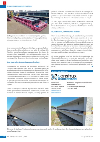 ELEMENTS PREFABRIQUES EN BETON132 PBI %u2013 Pr%u00e9fa B%u00e9ton International %u2013 5 | 2025 www.cpi-worldwide.comLe processus de d%u00e9coffrage est r%u00e9alis%u00e9 par un groupe hydraulique central mobile qui alimente une unit%u00e9 de coffrage %u00e0 la fois. Des v%u00e9rins hydrauliques puissants avec des forces de pression allant jusqu'%u00e0 60 t sont utilis%u00e9s dans les cadres de serrage. Ils assurent la d%u00e9tente contr%u00f4l%u00e9e ainsi que la commande pr%u00e9cise du syst%u00e8me de r%u00e9traction pour le d%u00e9coffrage.Une plus-value %u00e9conomique pour le clientL'utilisation du syst%u00e8me de coffrage modulaire de Construx-Weckenmann peut offrir au client des avantages strat%u00e9giques et %u00e9conomiques %u00e9vidents. La possibilit%u00e9 d'exploiter plusieurs lignes de production de mani%u00e8re ind%u00e9pendante et en %u00e9conomisant de l'espace peut augmenter consid%u00e9rablement le d%u00e9bit total, sans avoir %u00e0 investir dans de grandes fondations de pr%u00e9contrainte. En m%u00eame temps, le groupe hydraulique mobile peut r%u00e9duire les temps d'arr%u00eat lors du processus de d%u00e9coffrage et permet une cadence rapide.Gr%u00e2ce au design du coffrage r%u00e9glable avec pr%u00e9cision, diff%u00e9rentes g%u00e9om%u00e9tries d'%u00e9l%u00e9ments de construction peuvent %u00eatre r%u00e9alis%u00e9es de mani%u00e8re flexible. De plus, une large gamme de produits peut %u00eatre couverte avec un stock de coffrages relativement faible. Cela r%u00e9duit les co%u00fbts d'investissement et permet une production %u00e9conomiquement %u00e9volutive, en particulier lorsque la demande est volatile ou li%u00e9e %u00e0 un projet.Au total, il peut en r%u00e9sulter un taux d'utilisation nettement plus %u00e9lev%u00e9 de la surface de production, un agencement optimis%u00e9 de l'installation et un processus de fabrication flexible et s%u00fbr pour l'avenir.Le partenariat, un facteur de r%u00e9ussiteOutre le savoir-faire technique, la collaboration partenariale a %u00e9galement %u00e9t%u00e9 un facteur de r%u00e9ussite essentiel de ce projet. Du d%u00e9veloppement du concept %u00e0 la mise en service sur site, en passant par la fabrication, Construx-Weckenmann a su convaincre par son approche pratique du projet, ax%u00e9e sur la recherche de solutions. La formation intensive des op%u00e9rateurs, l'%u00e9troite concertation avec le client et la r%u00e9action flexible aux exigences sp%u00e9cifiques du projet ont permis une int%u00e9gration sans probl%u00e8me dans la production en cours.Ce projet souligne une fois de plus la comp%u00e9tence de Construx-Weckenmann en tant que partenaire technologique pour les usines de pr%u00e9fabrication qui souhaitent faire %u00e9voluer leurs capacit%u00e9s tout en p%u00e9rennisant leurs processus %u2013sans faire de compromis sur la qualit%u00e9, la flexibilit%u00e9 ou la s%u00e9curit%u00e9. nCoffrage Combi modulaire en version compacte %u2013 particuli%u00e8rement adapt%u00e9 aux petites dalles en T et aux g%u00e9om%u00e9tries changeantes avec un encombrement limit%u00e9.AUTRES INFORMATIONSWeckenmann Anlagentechnik GmbH & Co. KG Birkenstra%u00dfe 1 72358 Dormettingen, Allemagne T +49 7427 94930 Construx bvba Hazebeekstraat 11 8531 Hulste, Belgique T +32 56724793 info@construx.eu www.construx.eu %u00c9l%u00e9ments de dalles en T pr%u00e9contraints avec une tr%u00e8s grande qualit%u00e9 de surface gr%u00e2ce %u00e0 des vibreurs int%u00e9gr%u00e9s et une g%u00e9om%u00e9trie de coffrage pr%u00e9cise.