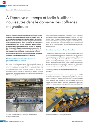 ELEMENTS PREFABRIQUES EN BETON134 PBI %u2013 Pr%u00e9fa B%u00e9ton International %u2013 5 | 2025 www.cpi-worldwide.comAujourd'hui, les coffrages magn%u00e9tiques modernes doivent faire bien plus que simplement tenir %u2013 ils doivent suivre le rythme de la production, pouvoir %u00eatre utilis%u00e9s de mani%u00e8re flexible, raccourcir les temps de montage et minimiser les erreurs de manipulation. Ratec, sp%u00e9cialiste du coffrage magn%u00e9tique depuis plus de trois d%u00e9cennies, rel%u00e8ve ces d%u00e9fis en d%u00e9veloppant continuellement sa gamme de produits. Les derniers d%u00e9veloppements s'attaquent de mani%u00e8re cibl%u00e9e aux probl%u00e8mes typiques rencontr%u00e9s dans la pratique des %u00e9l%u00e9ments pr%u00e9fabriqu%u00e9s et fournissent des solutions conviviales qui am%u00e9liorent %u00e0 la fois la qualit%u00e9 et l'efficacit%u00e9. Quelques exemples sont pr%u00e9sent%u00e9s ci-dessous.Fixation d'%u00e9l%u00e9ments d'isolation thermique pour les raccords de balconsLes ponts thermiques au niveau des raccords de balcon ne constituent pas seulement un probl%u00e8me %u00e9nerg%u00e9tique, mais aussi un probl%u00e8me de construction. L'utilisation d'%u00e9l%u00e9ments d'isolation thermique tels l'Isokorb permet de r%u00e9soudre ce probl%u00e8me sur le plan de la construction. Dans la pratique cependant, le positionnement dans le coffrage est souvent laborieux et sujet %u00e0 des erreurs.Ratec a d%u00e9velopp%u00e9 un syst%u00e8me d'adaptateur %u00e0 base d'aimants qui fixe l'Isokorb de mani%u00e8re s%u00fbre dans le coffrage %u2013 sans avoir recours %u00e0 des vissages co%u00fbteux ou %u00e0 des supports suppl%u00e9mentaires. Cette solution permet un positionnement rapide, flexible et r%u00e9utilisable, optimise les processus de travail et am%u00e9liore en m%u00eame temps la qualit%u00e9 des %u00e9l%u00e9ments pr%u00e9fabriqu%u00e9s en b%u00e9ton. Aimant de relev%u00e9 pour coffrage d'escaliersL'aimant pour une fixation fiable de la peau de coffrage dans les coffrages d'escaliers est un compl%u00e9ment de la gamme. Il est disponible en diff%u00e9rentes hauteurs, dont 150 mm et 180 mm, et s'adapte de mani%u00e8re flexible aux diff%u00e9rentes exigences. Le montage est simple gr%u00e2ce %u00e0 la plaque %u00e0 visser pr%u00e9sentant la disposition des trous. Cette solution bien pens%u00e9e garantit un positionnement rapide et pr%u00e9cis, ce qui rend le processus de production plus efficace et plus pr%u00e9cis. Solutions pour les %u00e9l%u00e9ments %u00e0 forte %u00e9paisseur de paroiPour la production de sections de murs %u00e9paisses, jusqu'%u00e0 120 cm, Ratec a d%u00e9velopp%u00e9 un coffrage de support modulaire. Le client l'utilise pour la fabrication de murs sandwich de 840 mm d'%u00e9paisseur avec des d%u00e9tails plus complexes. Le coffrage marque des points gr%u00e2ce %u00e0 sa facilit%u00e9 d'utilisation, sa grande stabilit%u00e9 et sa construction transportable par grue. Il est fix%u00e9 %u00c0 l'%u00e9preuve du temps et facile %u00e0 utiliser : nouveaut%u00e9s dans le domaine des coffrages magn%u00e9tiquesRatec GmbH, 68766 Hockenheim, Allemagne Solution magn%u00e9tique pour la fixation des %u00e9l%u00e9ments d'isolation thermiqueAimant de relev%u00e9 pour coffrage d'escaliers